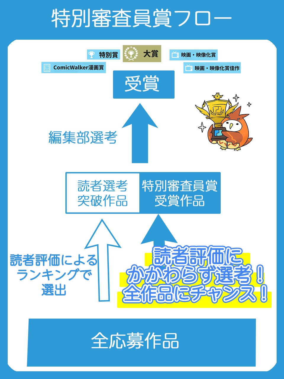 特別審査員は、カクヨム公式レビュワー(特集ページ(https://kakuyomu.jp/features)でレビューを執筆いただいているライターの皆さま)、運営が指名する作品の発掘力の高いカクヨムプロ作家ユーザーがつとめます。