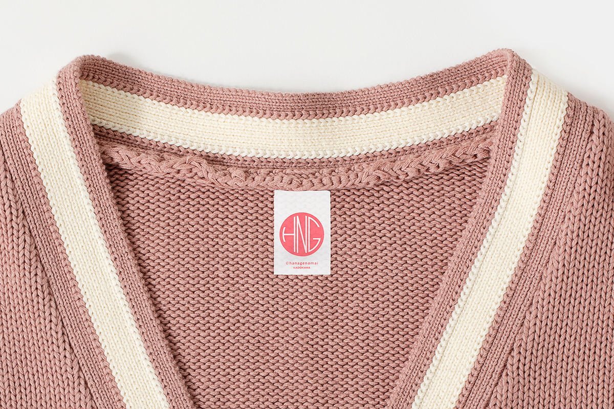 作中でキャラクターが着用しているカーディガンと同様、オリジナルアパレルブランド「HNG」のロゴタグ付きです。
