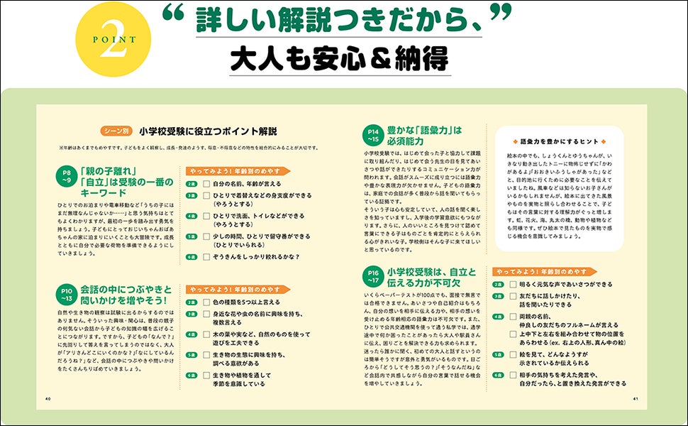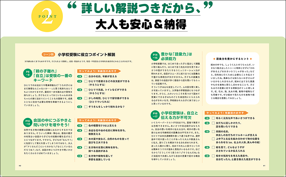 本作は、小学校受験に驚異の進学率をほこる名門塾・伸芽会を監修に迎え、小学校受験に必要な力が“絵本を読んでいるうちに身につけられる”という画期的な絵本です。小学校受験に必要な力は、たとえ受験をしなくても、これからの子どもたちに必要な力です。小学校受験が気になり始めた保護者はもちろん、わが子にこれからの世界で一生役立つ力のベースを身につけさせたい、と思う人のスタートブックとして最適な1冊です。