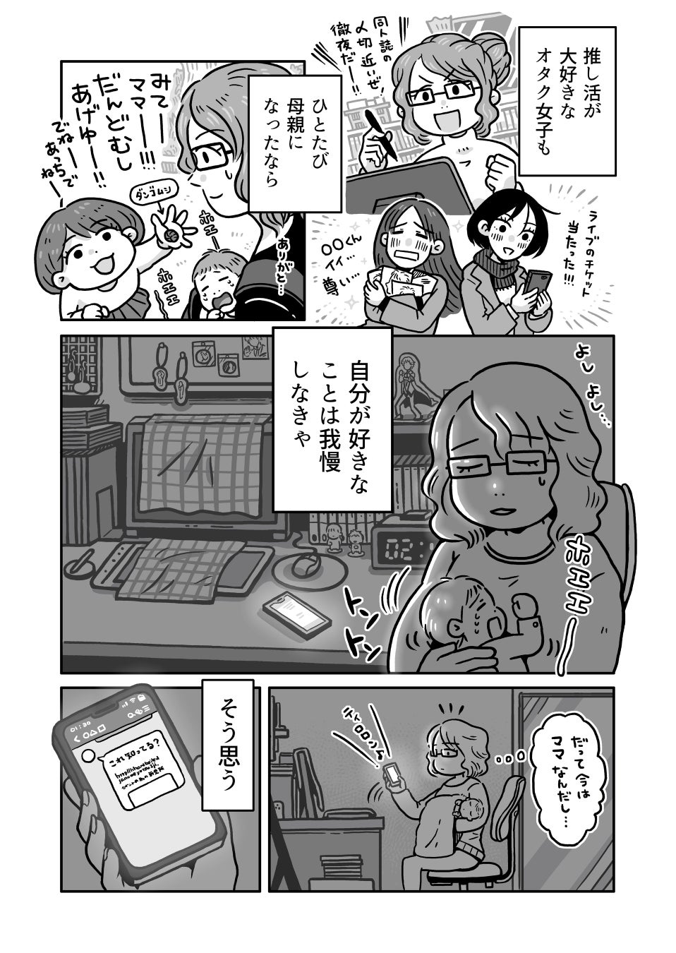 2人の子育てに疲弊している限界ワンオペママの四辻(よつつじ)。子どもは可愛いけれど、「自分の居場所がない」「生きている感じがしない」と常にストレスMAXな日々。そんな時出逢った推しジャンルで、二次創作に目覚め、毎日が輝くように。次は同人イベントに行きたい、しかし子どもを預ける場所がない……。そして、周りのオタクママ・パパたちも育児のために自分の好きを閉じ込めている現実を知って……そうだ自分で作ってしまおう!