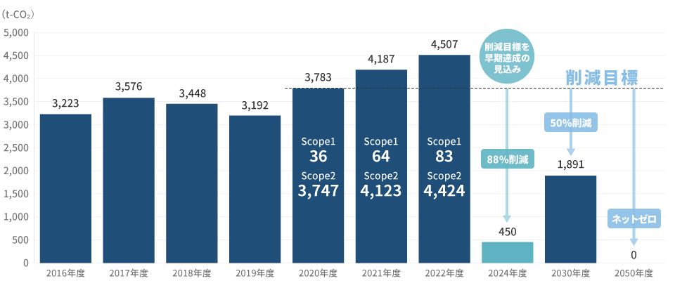 今回のところざわサクラタウンにおける電力の切り替えは、2023年1月に実施した自社ビル4棟の電力切り替えに続く取り組みとなります。当社の年間二酸化炭素排出量(2022年度実績)のうち76.9%(約3,468t-CO2)を実質ゼロにするものです。これにより、当社の二酸化炭素排出量を2024年度には2020年度実績(約3,783t-CO2)から約88%(約3,333t-CO2)削減できる見通しとなり、「2030年度までに2020年度比50%削減」とした温室効果ガス(GHG)排出量の削減目標を早期に達成する見込みです。今後はグループ会社への展開も検討し、各事業拠点での脱炭素化に向けた取り組みを推進してまいります。