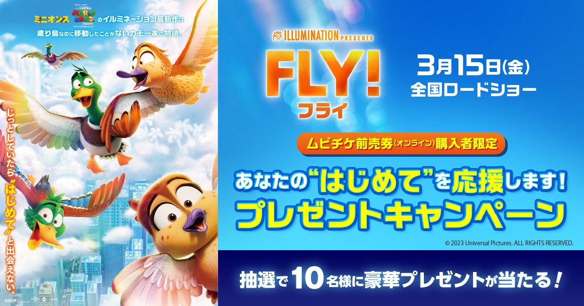 株式会社ムービーウォーカー(本社:東京都千代田区、代表取締役社長:五十嵐淳之)は、対象期間内に映画『FLY!/フライ!』のムビチケ前売券(オンライン)を購入のうえ「やってみたいこと」を指定のフォームから応募すると最高で18,000円分(税込)の賞品が当たる、「あなたの“はじめて”を応援します!プレゼントキャンペーン」を開始いたしました。
