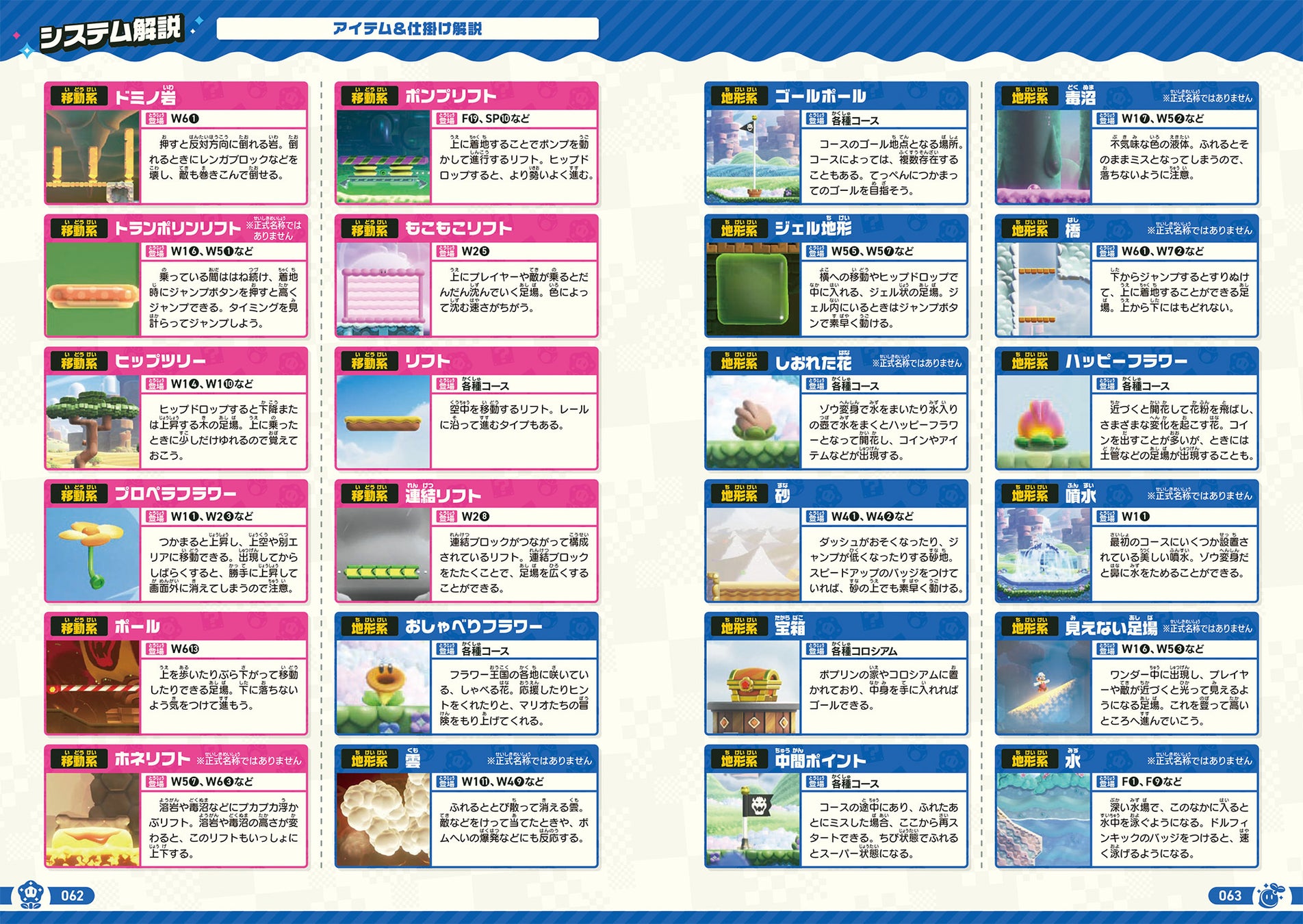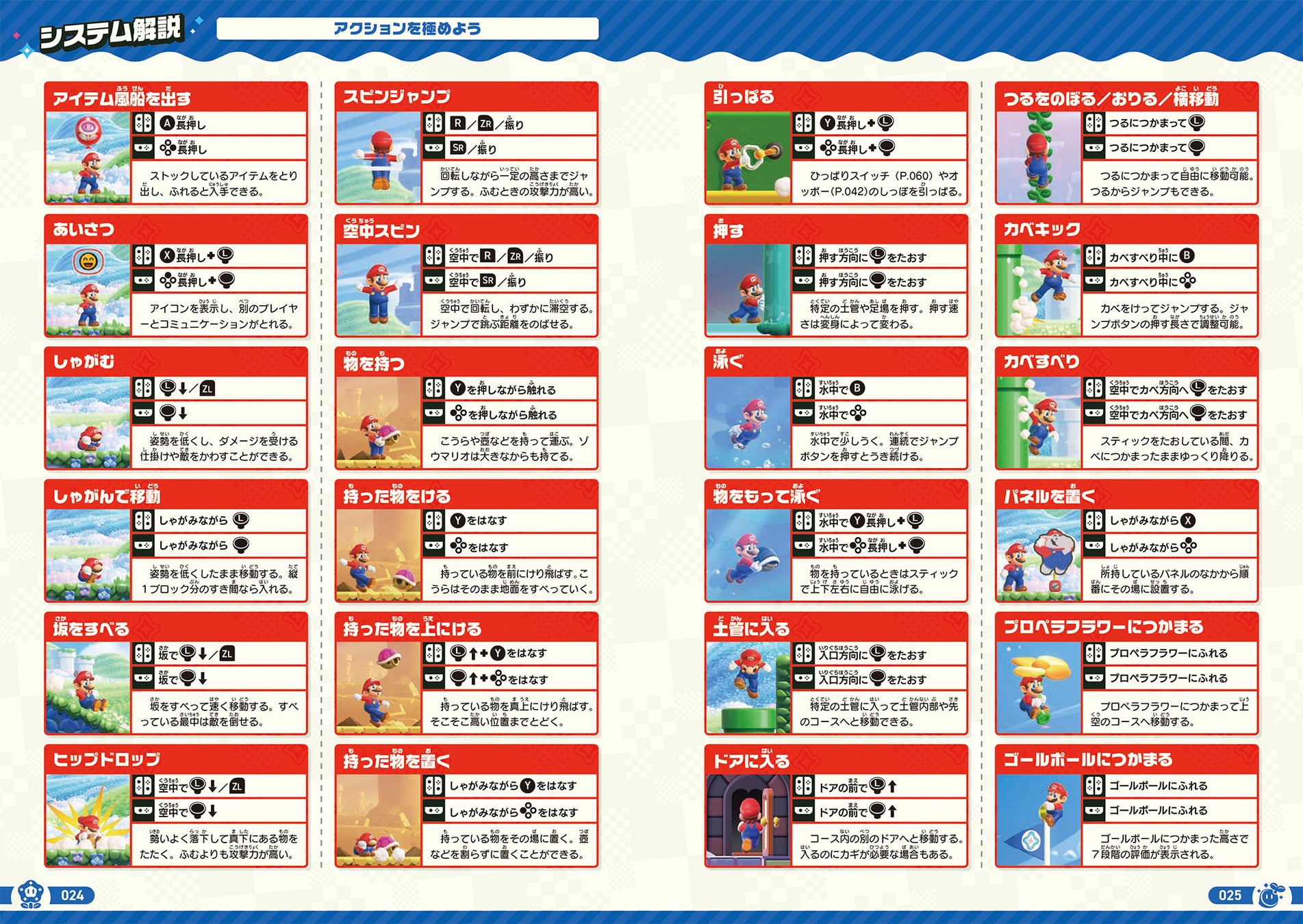 マリオやピーチ、ヨッシーなどの全12人のプレイヤーキャラの通常アクションはもちろん、パワーアップアイテムで変身したあとの特別な能力やアクション、つけることでキャラクターの能力がアップする本作の新要素「バッジ」によるアクション、もちろん「ワンダー」中のアクションまでわかりやすく紹介しています。