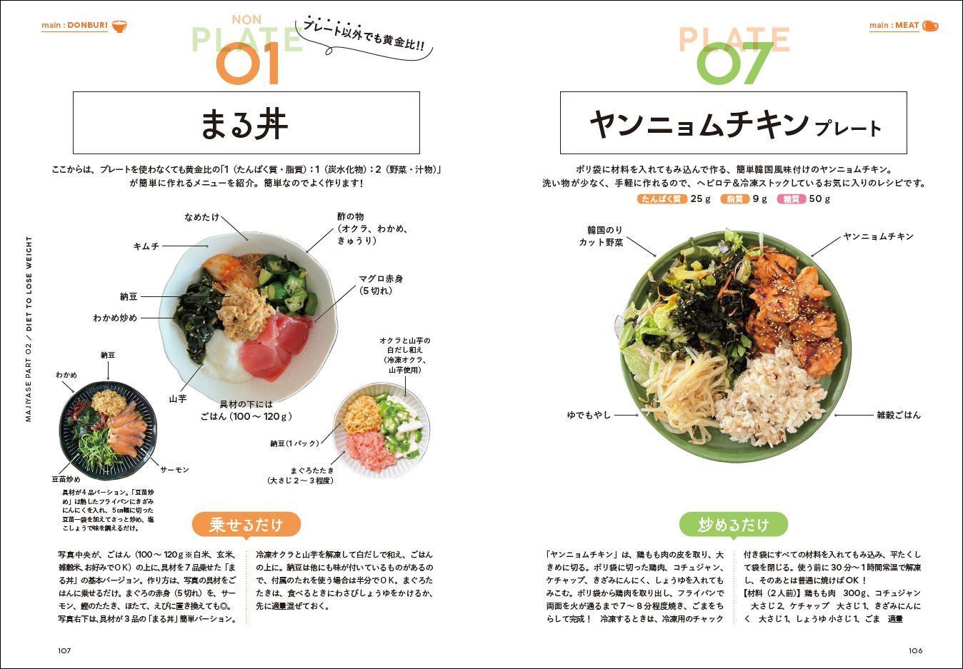 もう1つ、ダイエットで大事な要素である「食事」。まる式食べやせ法の基本は「プレート法」。丸い大きなお皿に「たんぱく質・脂質を1、炭水化物(糖質)を1、野菜・汁物を2」の割合で配膳するだけで、ダイエット中の食事として理想の栄養バランスになります。本書ではそんな理想の食事レシピを12品紹介。暴飲暴食してしまった翌日のリカバリーにもぴったりのレシピばかりです。