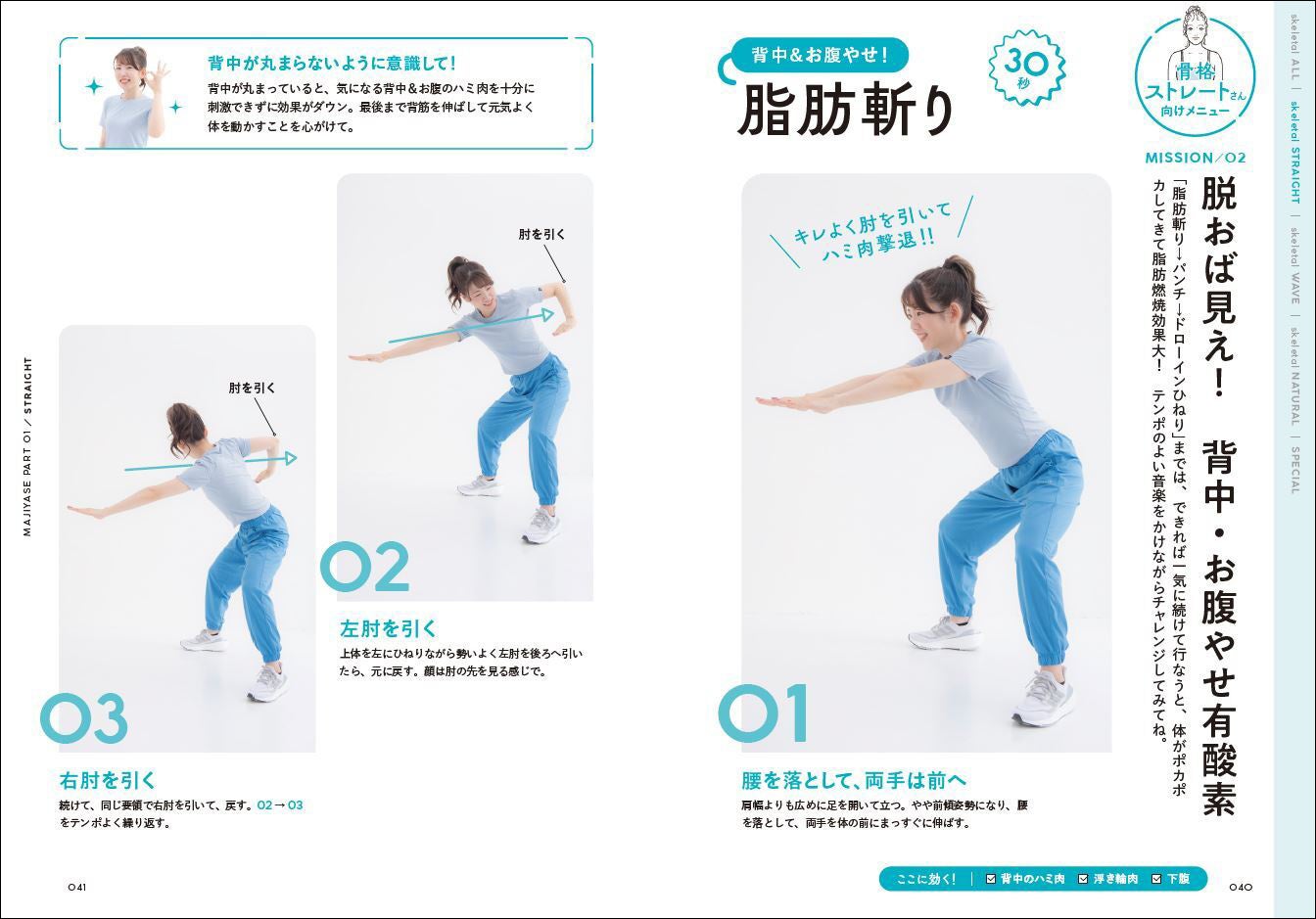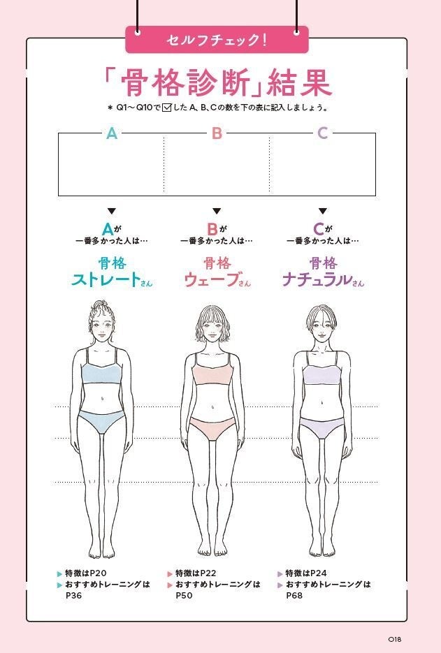 骨格タイプは「骨格ナチュラルさん」「骨格ストレートさん」「骨格ウェーブさん」の3つに分かれます。たとえば「骨格ストレートさん」は筋肉がつきやすいので、筋トレをやりすぎると固太りになり、せっかくの苦労が水の泡になることも。「骨格ストレートさん」におすすめなのは筋トレではなく有酸素運動、といった具合に、まるさんが各骨格タイプに合うトレーニングを提案しています。またまるさんの提案するトレーニングは、楽しい動きのものが多いのも、ダイエット女子に支持される理由です。