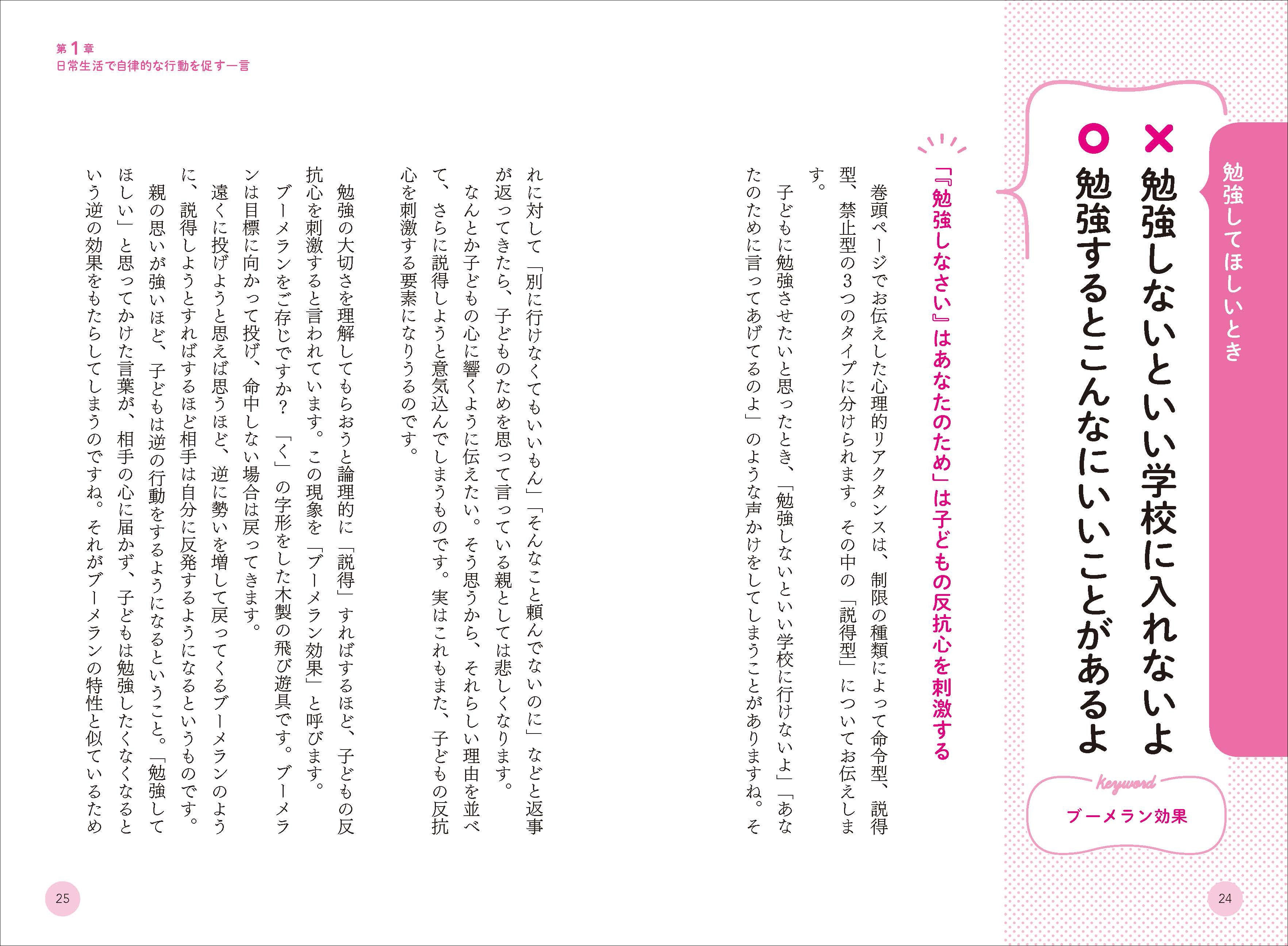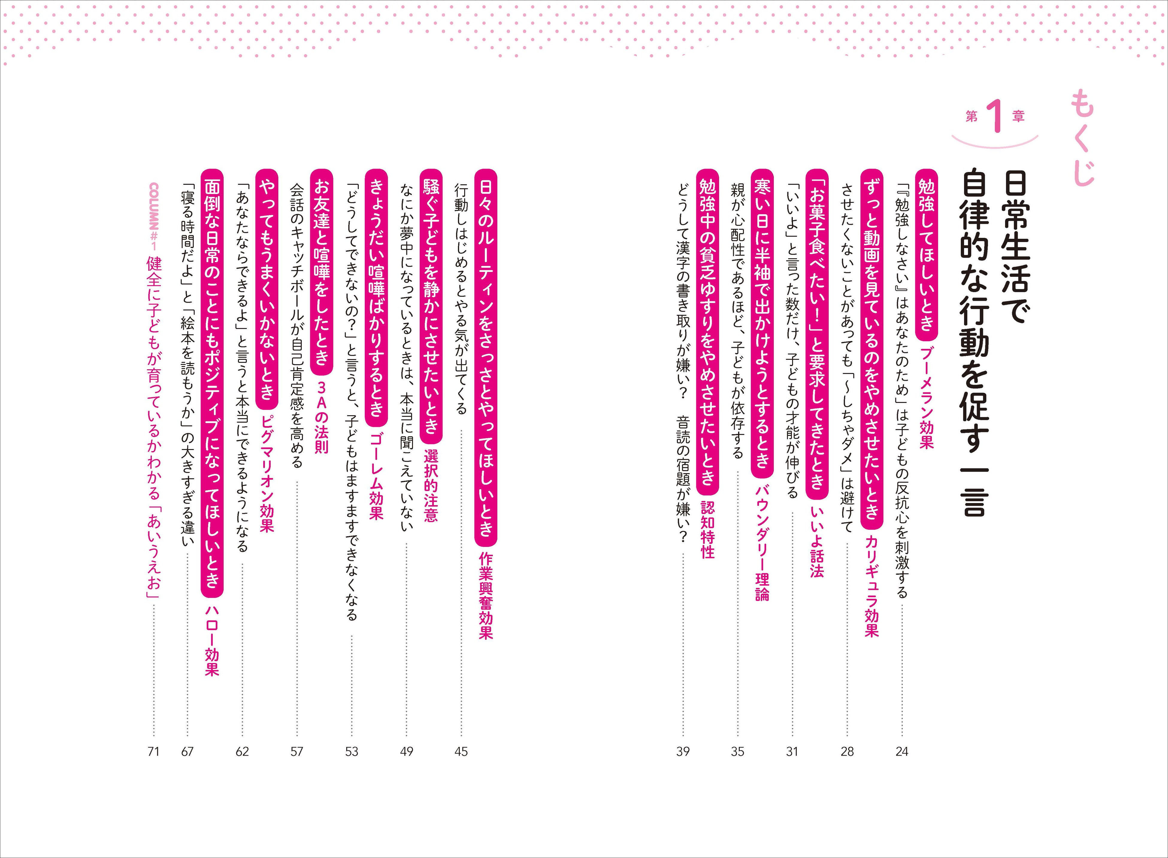大学機関にて子どもの発達心理や行動科学を研究した著者が、延べ20,000人もの親子と関わることで得た「効果的な一言」をまとめた1冊になります。