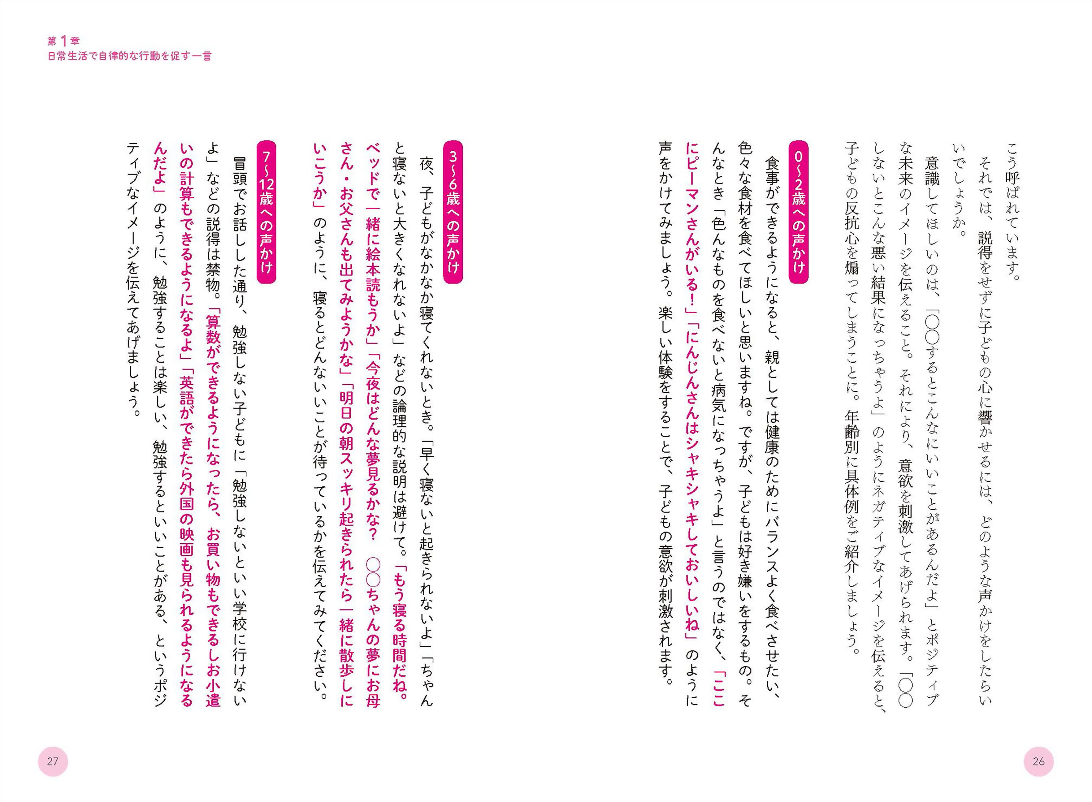 さらに、0〜2歳、3〜6歳、7〜12歳と子どもの成長に合わせた声かけ例をそれぞれ掲載。合計100以上の声かけ例から子どもに合ったコミュニケーションが可能です。