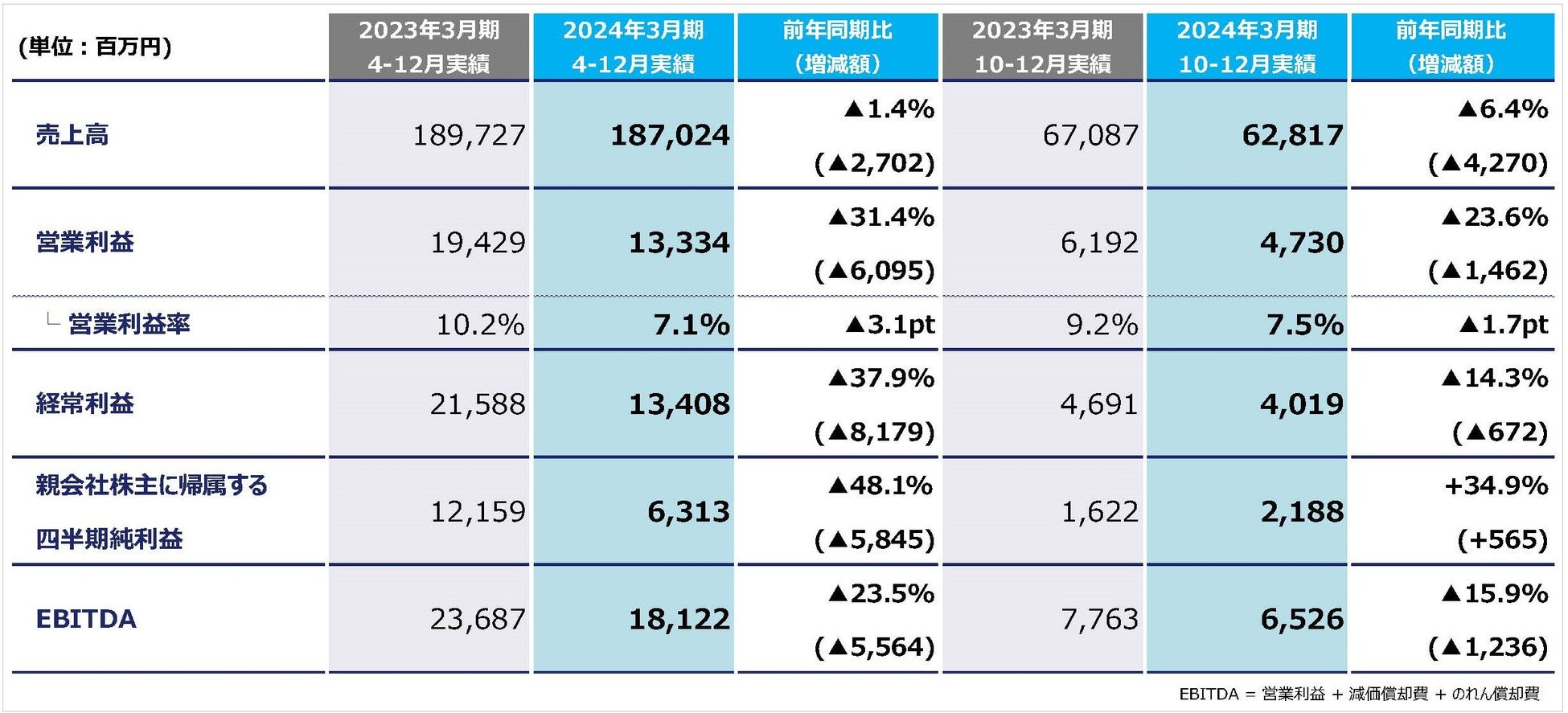 ◆2024年3月期第3四半期累計(4-12月)連結業績:売上高1.4%減、営業利益31.4%減、親会社株主に帰属する四半期純利益48.1%減