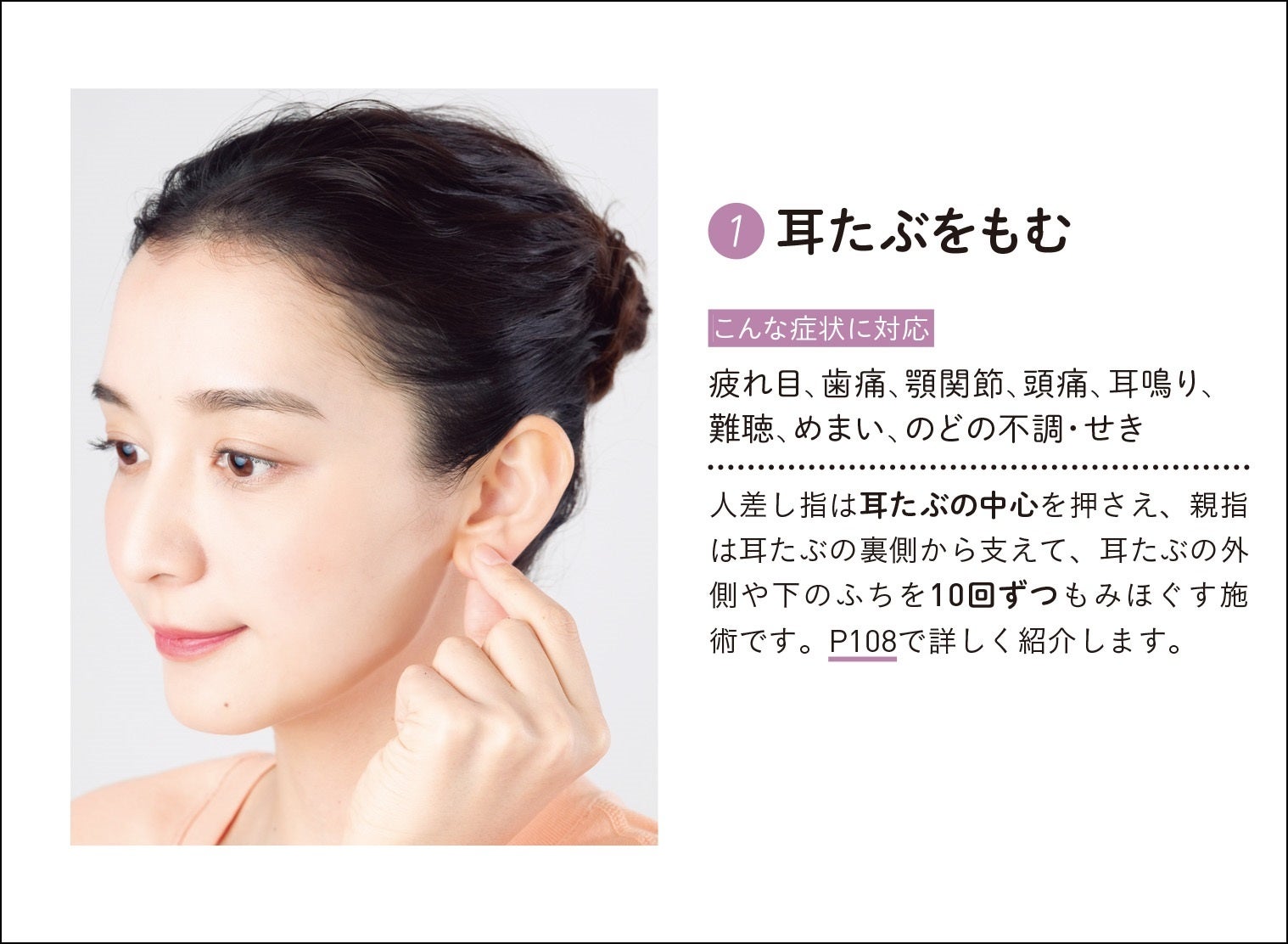 本書では、疲れ目、リフトアップ・小顔、美肌、ストレス解消、メンタル改善・リラックス効果、不眠、自律神経を整える、免疫力を上げる、冷え性、高血圧・糖尿病、頭痛、肩こり・首こり、腰痛、膝痛、手指の症状・腱鞘炎、歯痛・顎関節(食いしばり)、耳鳴り・難聴、めまい・むくみ、食べ過ぎ防止・胃もたれ、鼻炎・アレルギー、のどの不調・せき、便秘、生理痛、更年期、前立腺・頻尿、認知症・二日酔い、薄毛・白髪の38の症状に対応する耳ツボをていねいに解説。