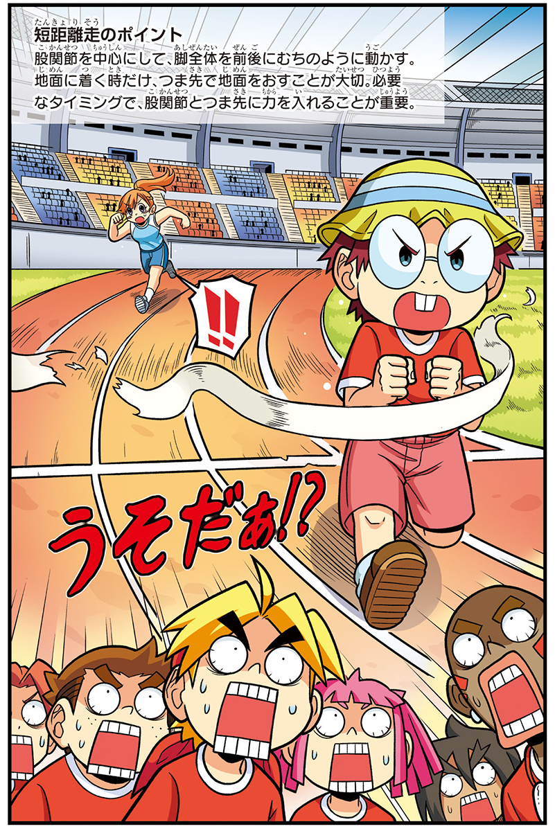 夢中になるストーリーを追いながら骨や筋肉のしくみ、そして短距離走や走高跳といった運動のポイントも楽しく&深く学ぶことができます。