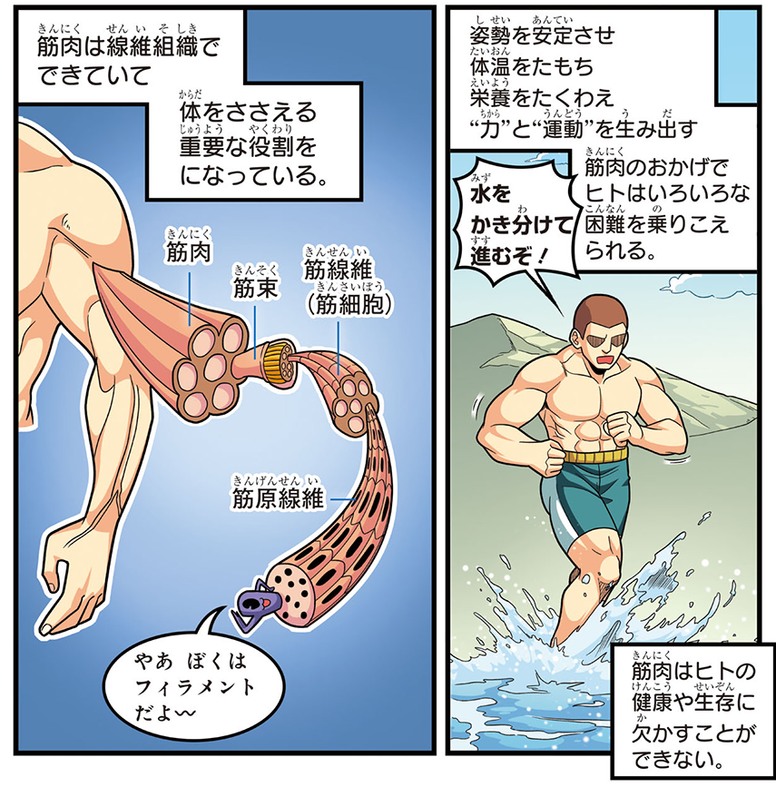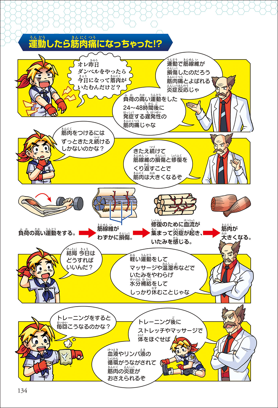 今回の「練習・トレーニング編」でも、専門的なテーマである「運動・筋肉・骨」について、夢中になれるストーリーを追いながら楽しく学べるようになっております。