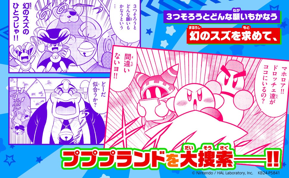 カービィ、チリー、マホロアの3人が、大切なスズを取り返すためにドロッチェ団を追いかけてあちこちを大捜索します。最後に願いを叶えるのは一体ダレなのか!?