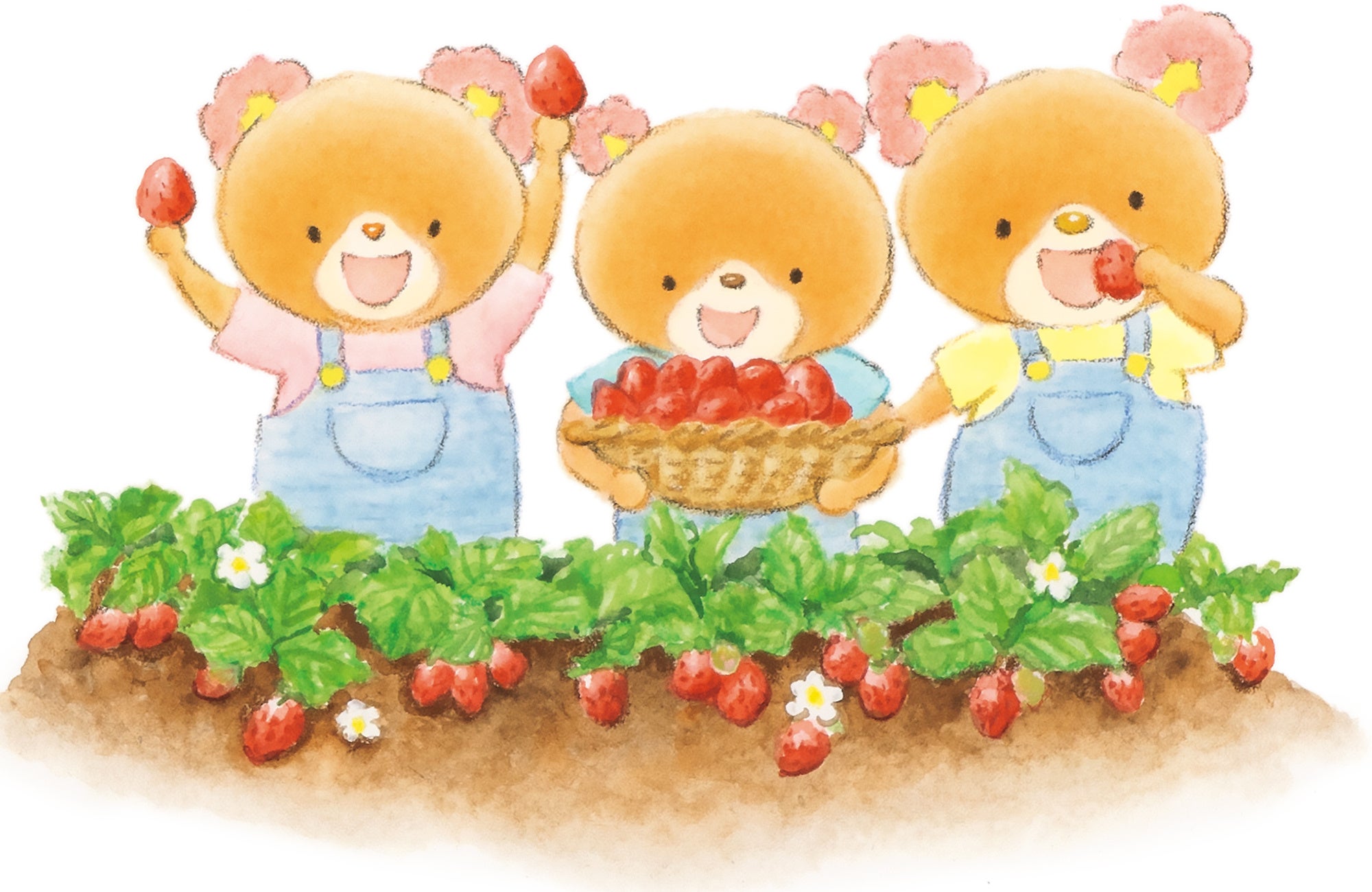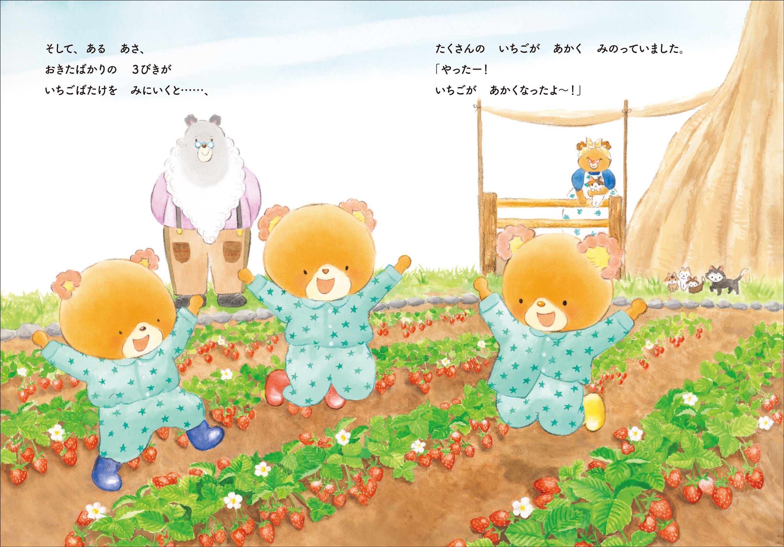 こぐまの3きょうだいのパッピ・プッペ・ポーが、いちごを育てて、いちごのケーキやパフェを作ります。