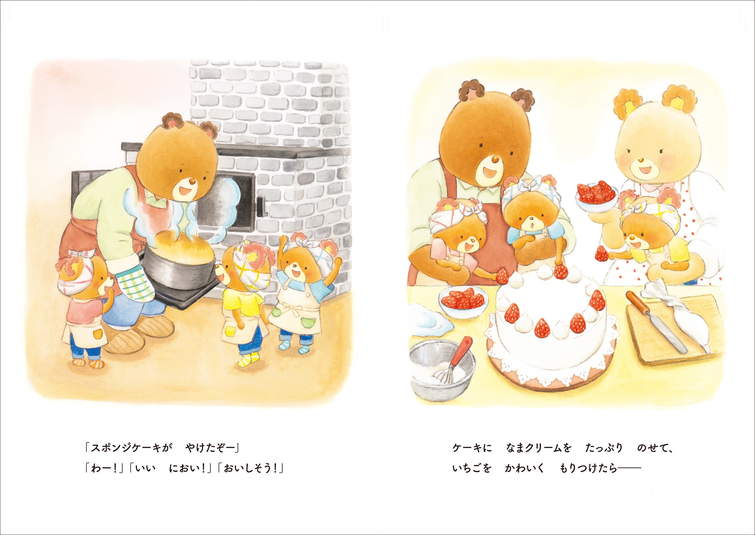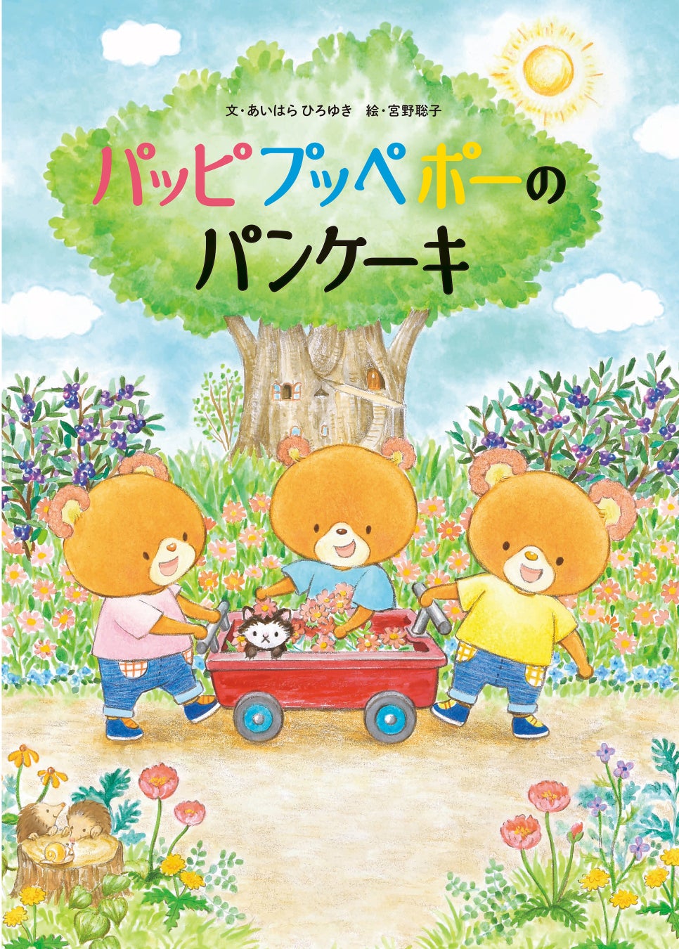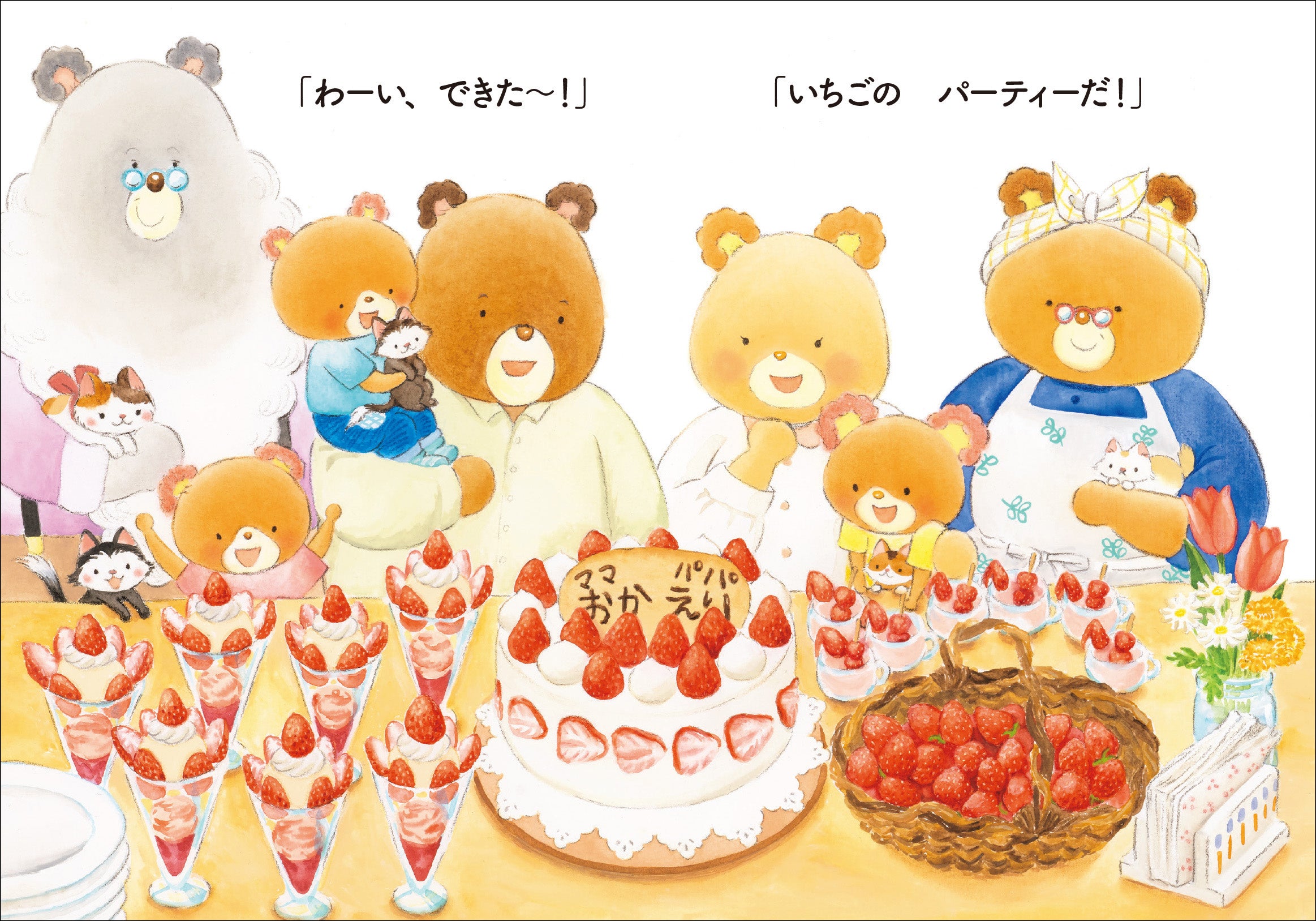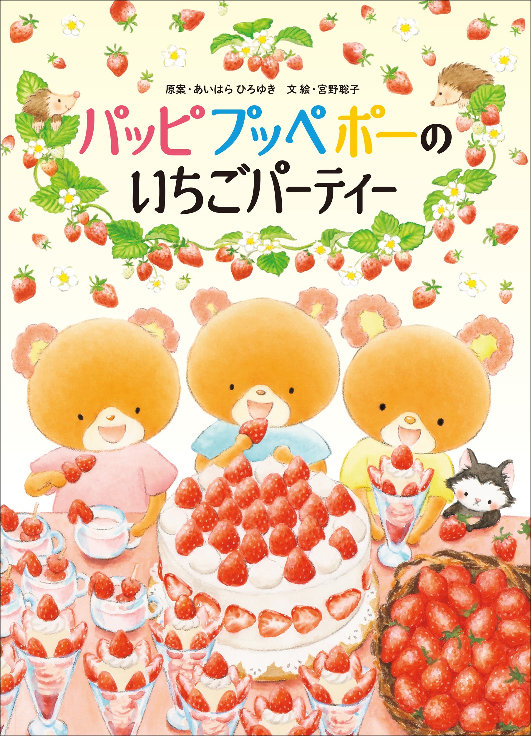 人気絵本シリーズ「くまのがっこう」のあいはらひろゆきさんと、『いちばんしあわせなおくりもの』で第7回リブロ絵本大賞を受賞した宮野聡子さんの新作絵本『パッピプッペポーのいちごパーティー』。