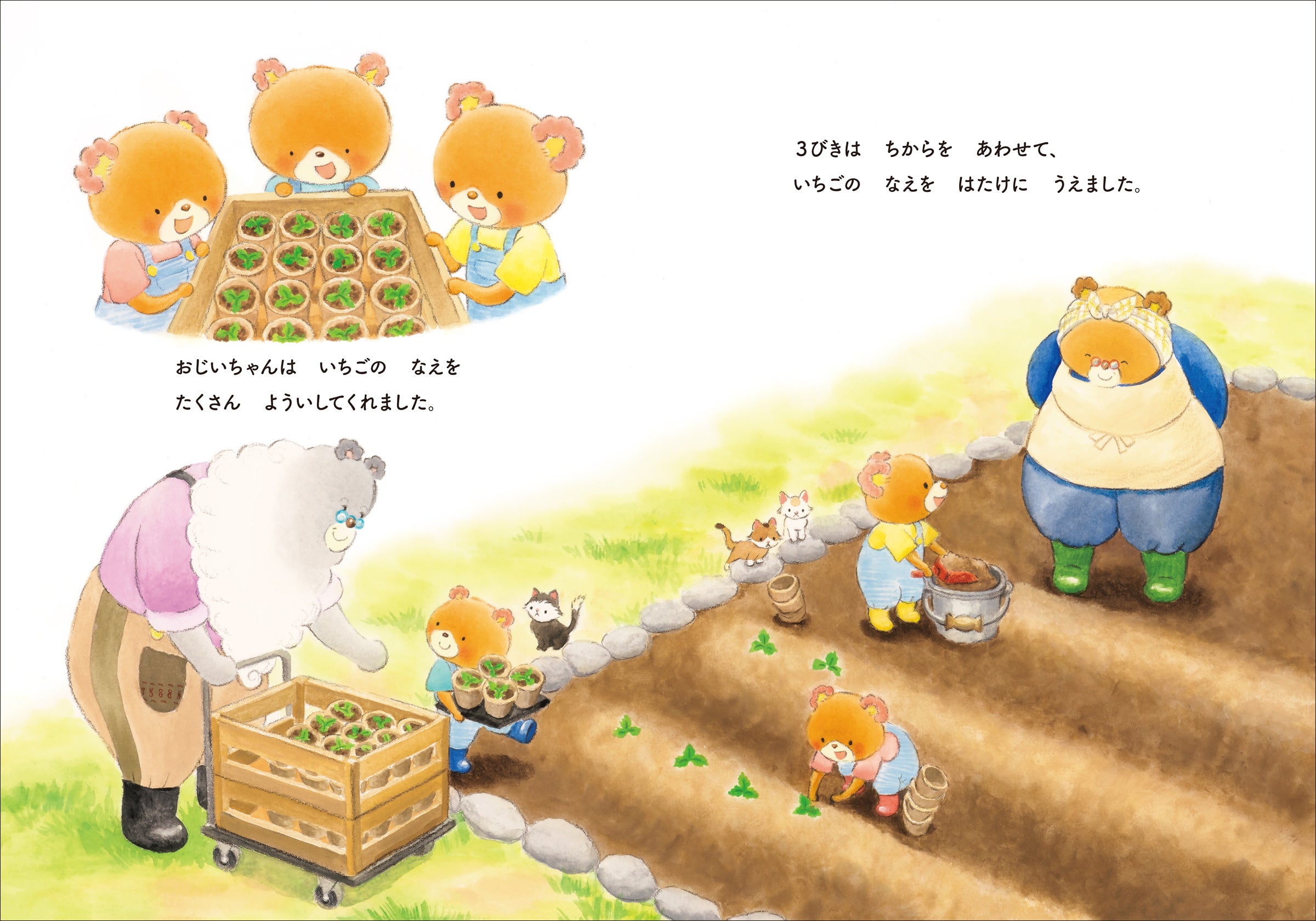 おじいちゃんが「いちごの実が赤くなるころ、ママとパパがかえってくるよ」と言いました。