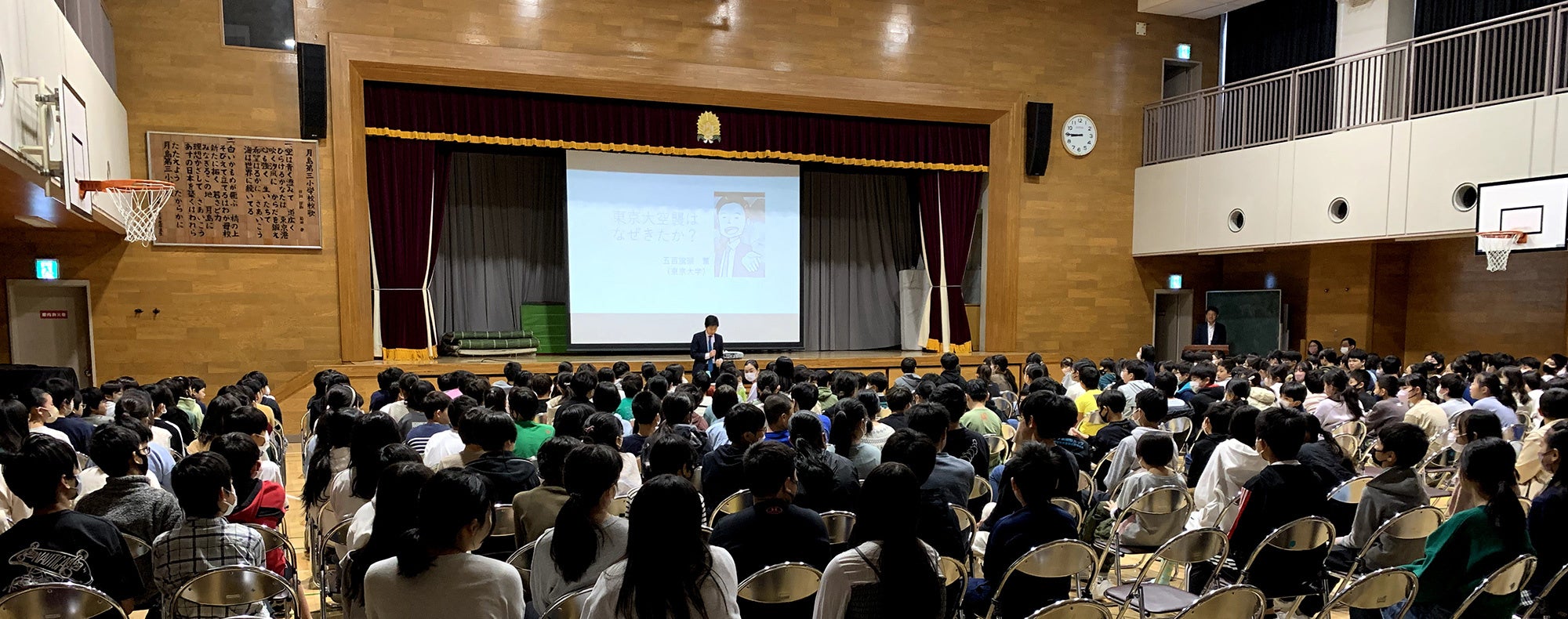 授業を受けたのは月島第三小学校の5・6年生あわせて300人弱。体育館いっぱいに集まった子どもたちがみな興味津々な様子で先生のお話に耳を傾けていました。