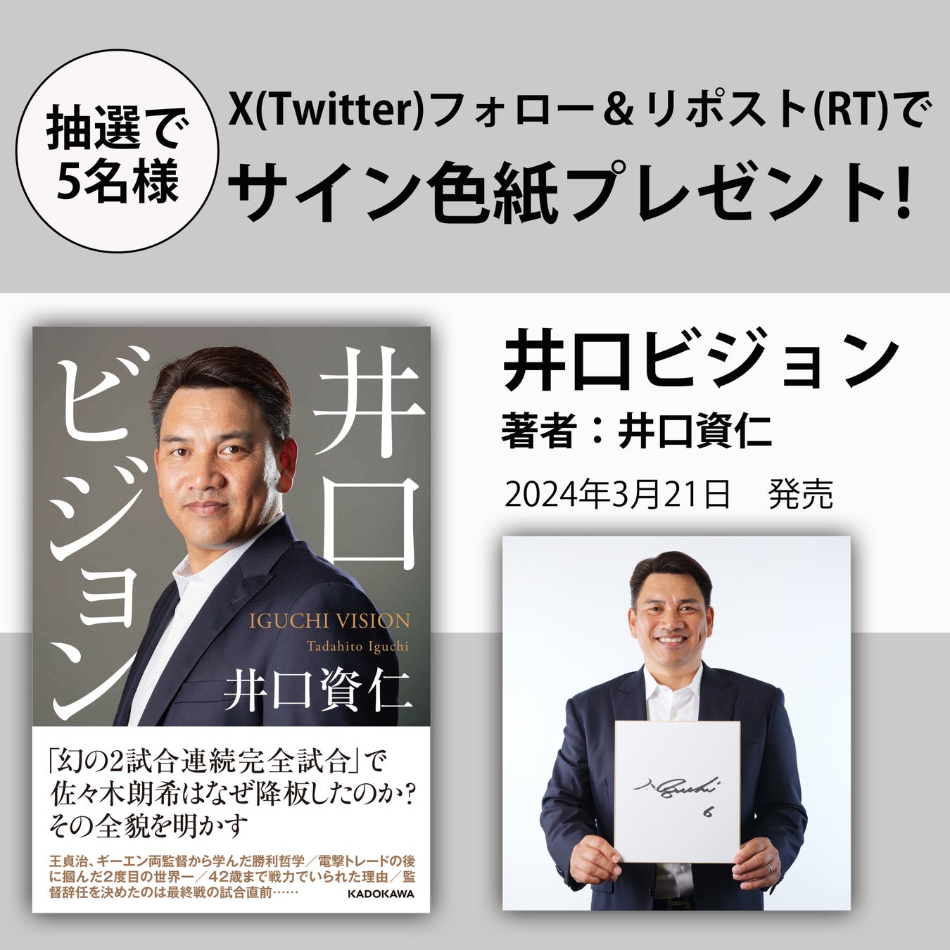 プロ野球では日本一、メジャーリーグでは世界一を経験し、千葉ロッテマリーンズ監督就任後は佐々木朗希らを育てた井口資仁氏。監督退任後初となる著書『井口ビジョン』が2024年3月21日(木)に発売。これを記念して、3月21日(木)正午よりX(Twitter)にてサイン色紙のプレゼントキャンペーンを行います。