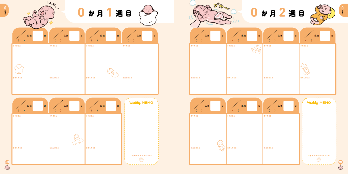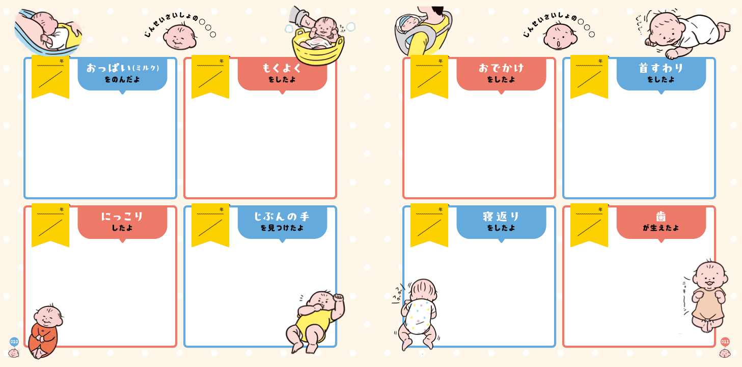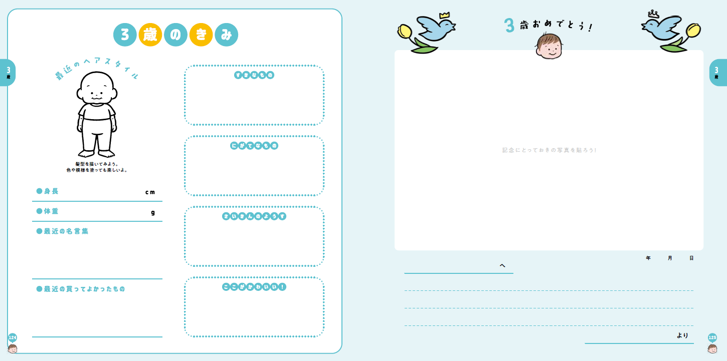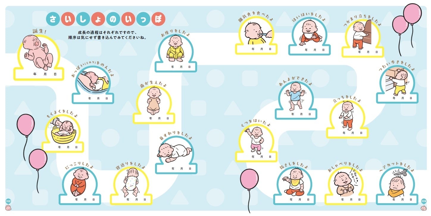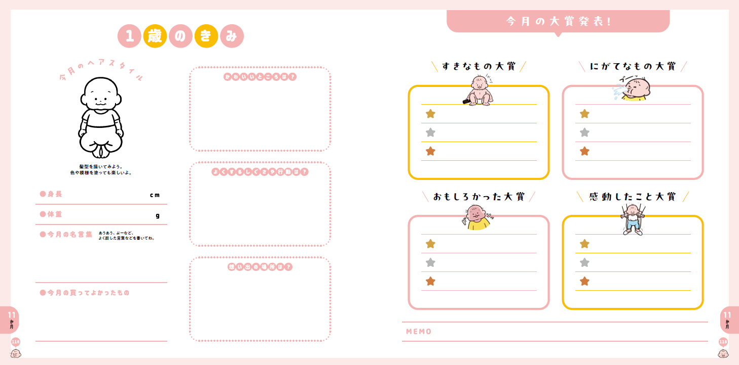 お子さんが「はじめてできたこと」を余すことなく収録でき、月齢ごとには「今月のヘアスタイル」を描く欄や、「今月の名言集」「すきなもの」「にがてなもの」を記入する欄など、他の育児日記にはないユニークな点も多数あり、楽しく書くことができます。