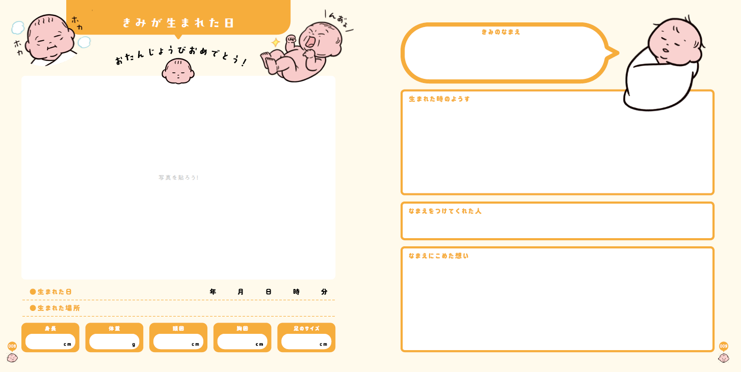育児中は貴重な瞬間ばかりなのに何もかもがあっという間に過ぎて終わってしまえば幻だったのではないかというくらい覚えていない! そんな大切な日々を気軽に楽しく残せるように、この育児日記をつくりました。