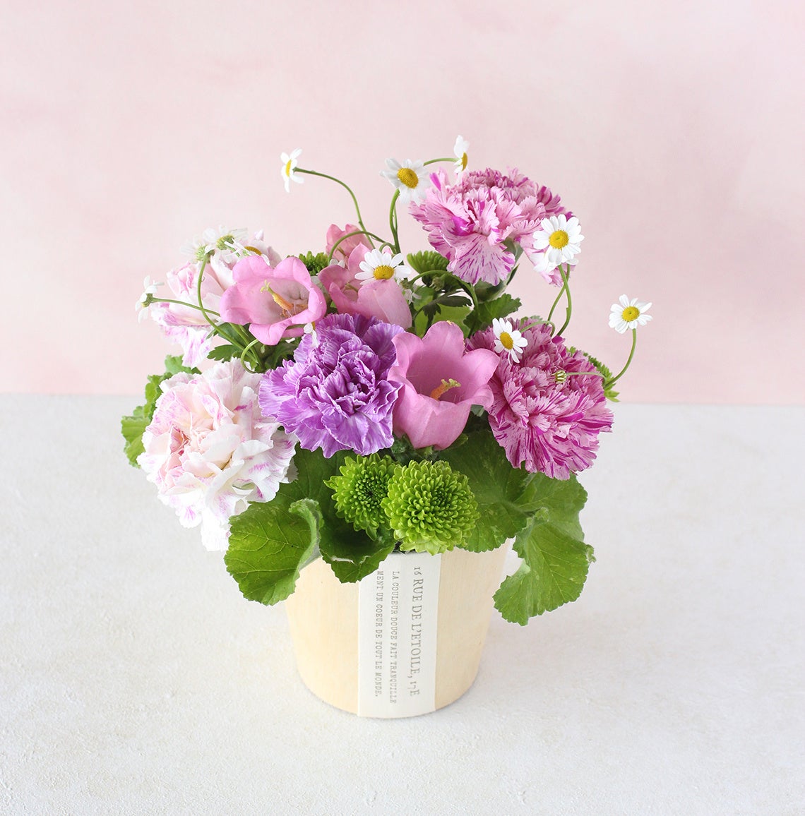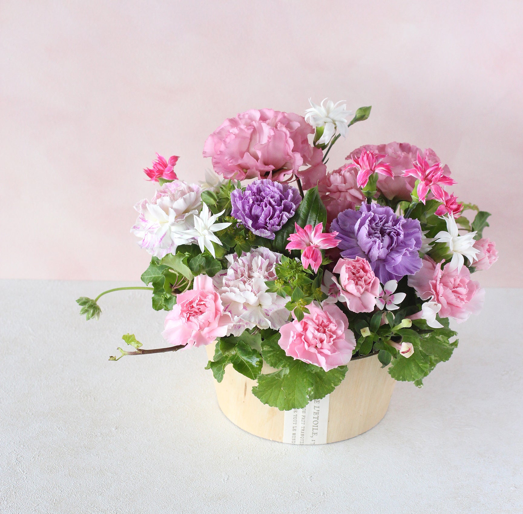 エレガントな雰囲気が好きなお母さんへはこちら。たくさんのカーネーションを盛り込むなかには、星形のかわいらしいカーネーションをたっぷりと。ムーンダストとあわせ、幸せへの願いをダブルで託せます。サブ花材として入れるトルコギキョウは優雅で、暑さにも強い花。暑くなりはじめる母の日のころでも、長く、きれいに楽しんでもらえます。
