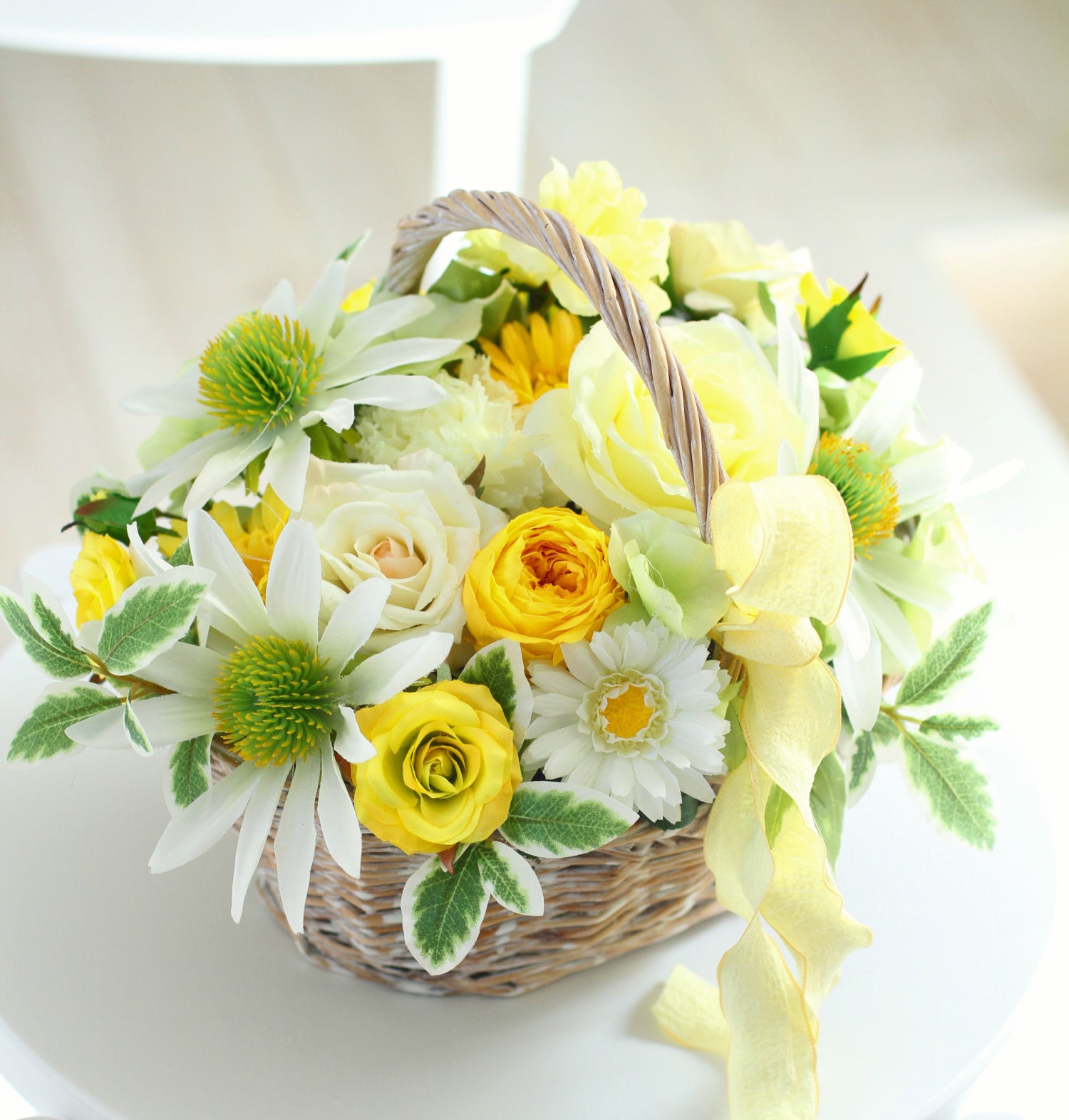 バスケットにたっぷり詰め込むのは、野原に咲いた宝石の花のイメージ。イエロー、ホワイトの組み合わせは、爽やかさ満点です。