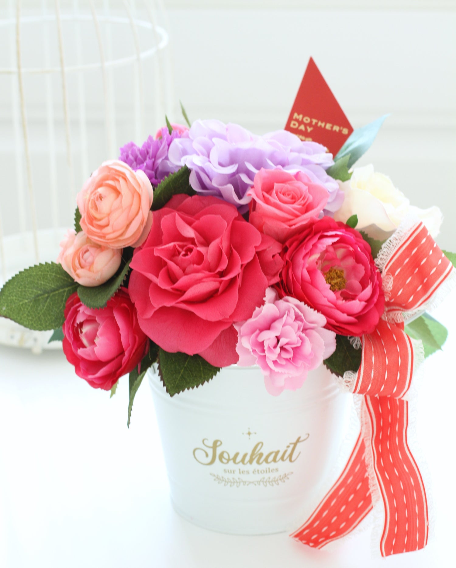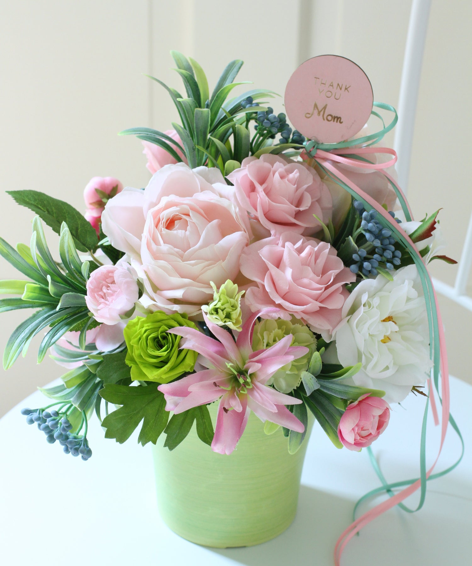 毎日忙しいお母さんへはプリザーブド&アーティフィシャルフラワーのアレンジを。クオリティの高い花材を厳選して制作するので、本物の花と見紛う美しさで、お母さんのそばで咲き続けてくれます。お母さんの好みに合わせ、数量限定で3タイプ用意しました。