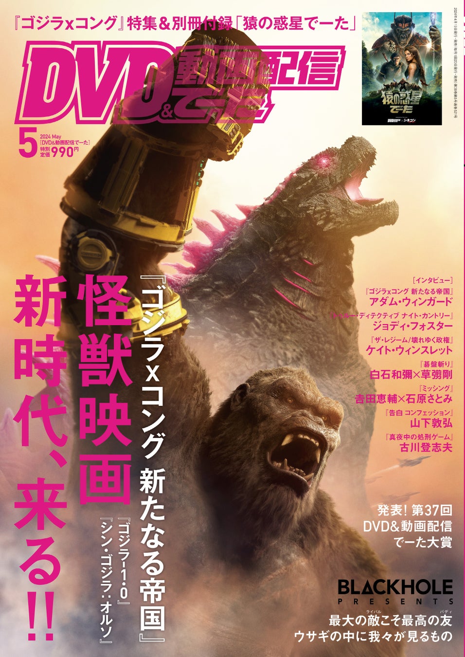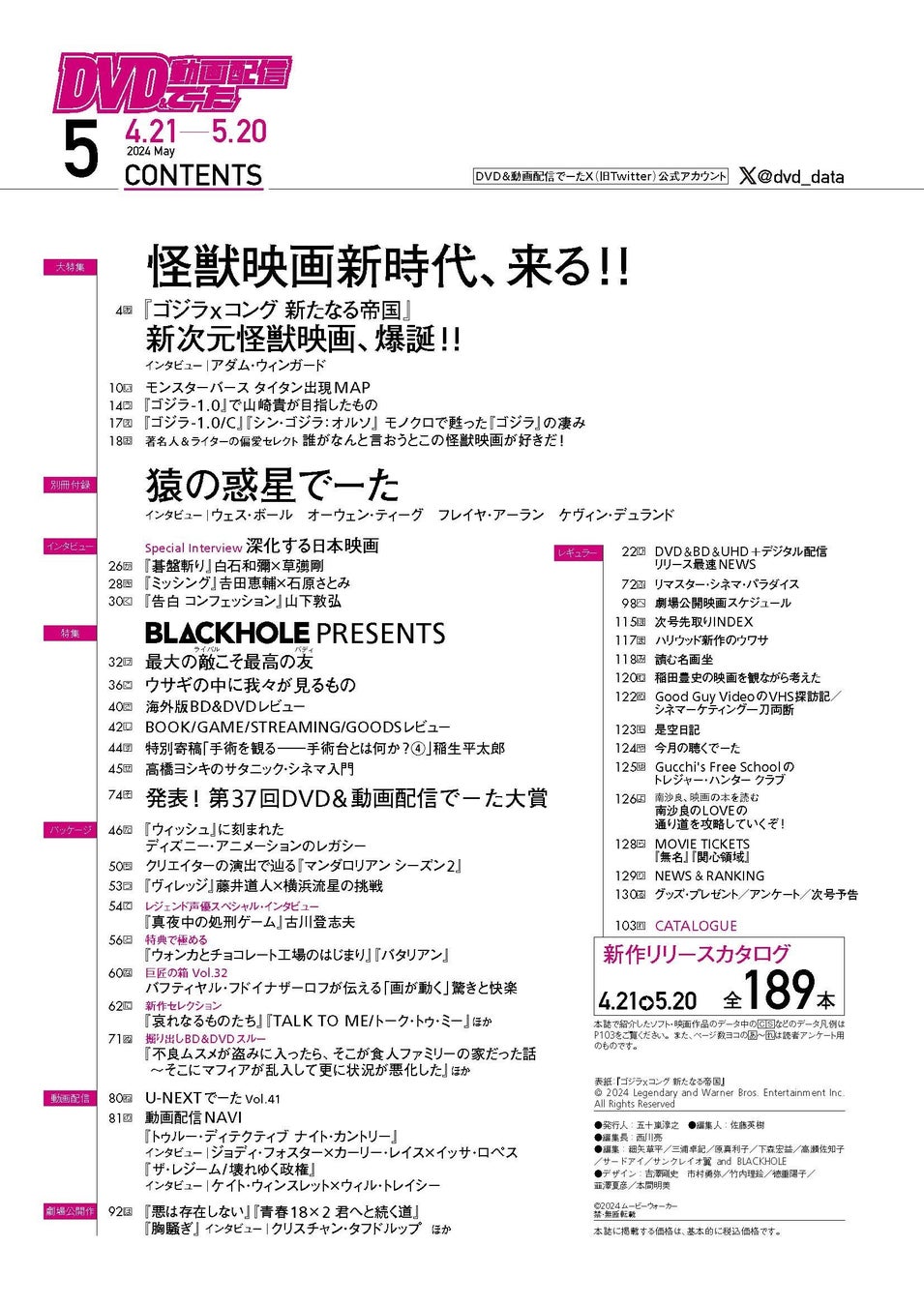 今号の大特集は「怪獣映画新時代、来る!!」。第96回アカデミー賞を受賞した『ゴジラ-1.0』や、全米で話題を呼んでいる『ゴジラ×コング 新たなる帝国』など、アツくたぎる怪獣映画をDVD&動画配信でーた編集部ならではの視点で深堀り! また、『猿の惑星/キングダム』の公開を記念した別冊付録「猿の惑星でーた」や、2021年にYouTubeチャンネルとして始まった高橋ヨシキ、てらさわホーク、柳下毅一郎の3人によるメディア「BLACKHOME」がお届けする特集記事、話題作に出演する俳優陣のインタビューなど盛りだくさんの内容でお届けします。