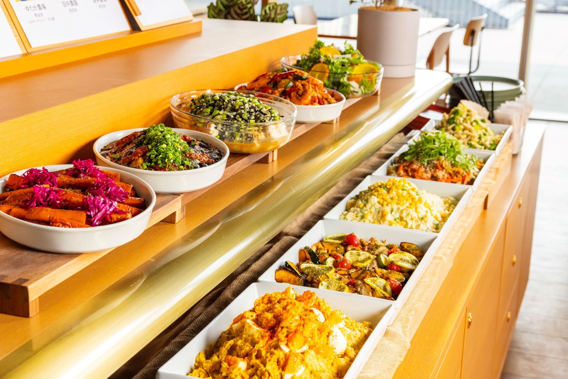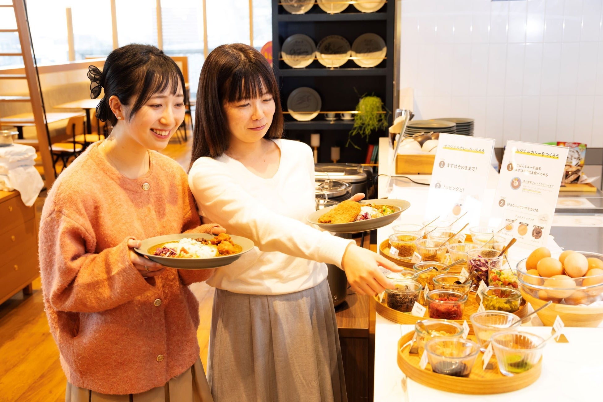 デリは定番のサラダや和洋惣菜など、彩り華やかな12品を取り揃え、自家製のロースト肉はシェフが目の前で切り分けるカッティングサービスを行います。カレーは2種のオリジナルスパイスカレーを、20種類のトッピングとともに提供します。最大60種が食べ放題で、11時から15時までの「ランチビュッフェ」は大人2,180円/小学生・幼児780円(平日料金・90分制)、14時10分からの「アフタヌーンビュッフェ」は大人1,480円/小学生・幼児480円(平日料金・時間制限なし)にて実施します。
