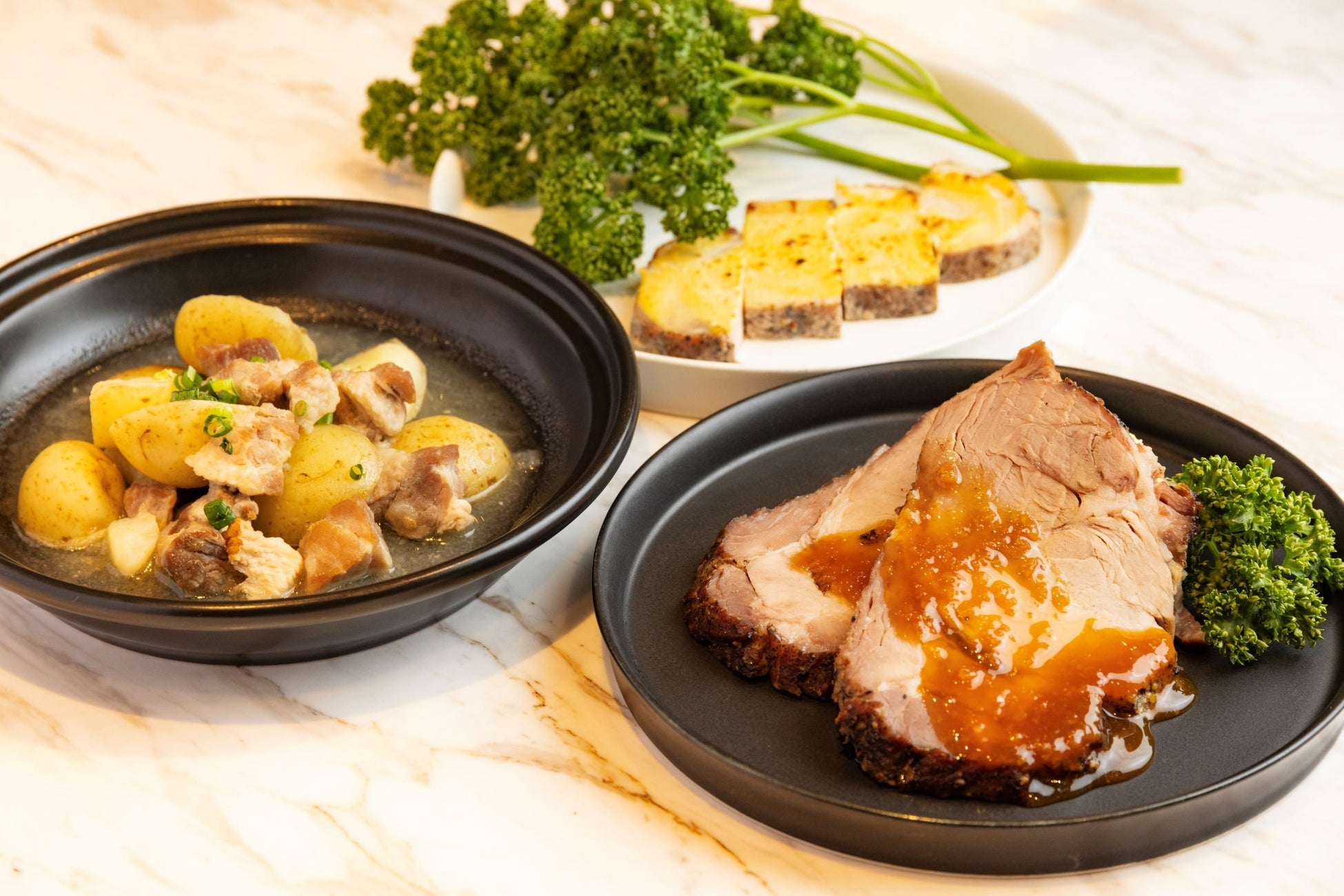 (左から)『ラブスコウス』北欧風肉じゃが、マスタード豚ロースステーキ、『フレスケスタイ』デンマーク風ローストポーク