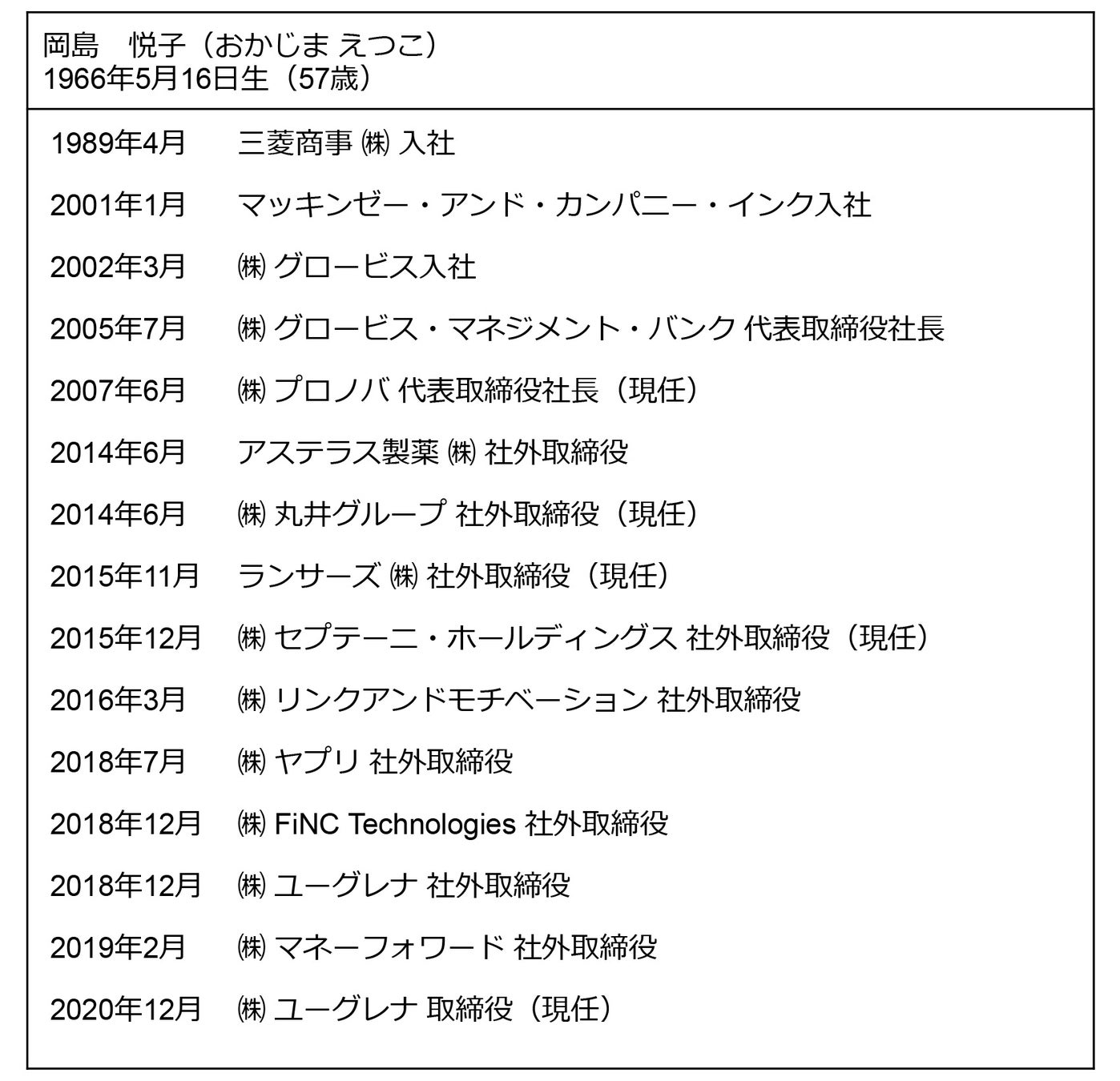 岡島悦子氏は、㈱プロノバの代表取締役社長を務め、コンサルタントとして、次世代経営者の育成支援や人材開発等に携わり、また、多くの企業の社外取締役を歴任する等、経営体制強化に関する豊富な経験と高い見識を有しております。これらの知見を経営に活かしていただくことを期待して、社外取締役として選任をお願いするものであります。同氏が選任された場合は指名委員として当社の役員候補者の選定等に対し、独立した立場から関与いただく予定です。