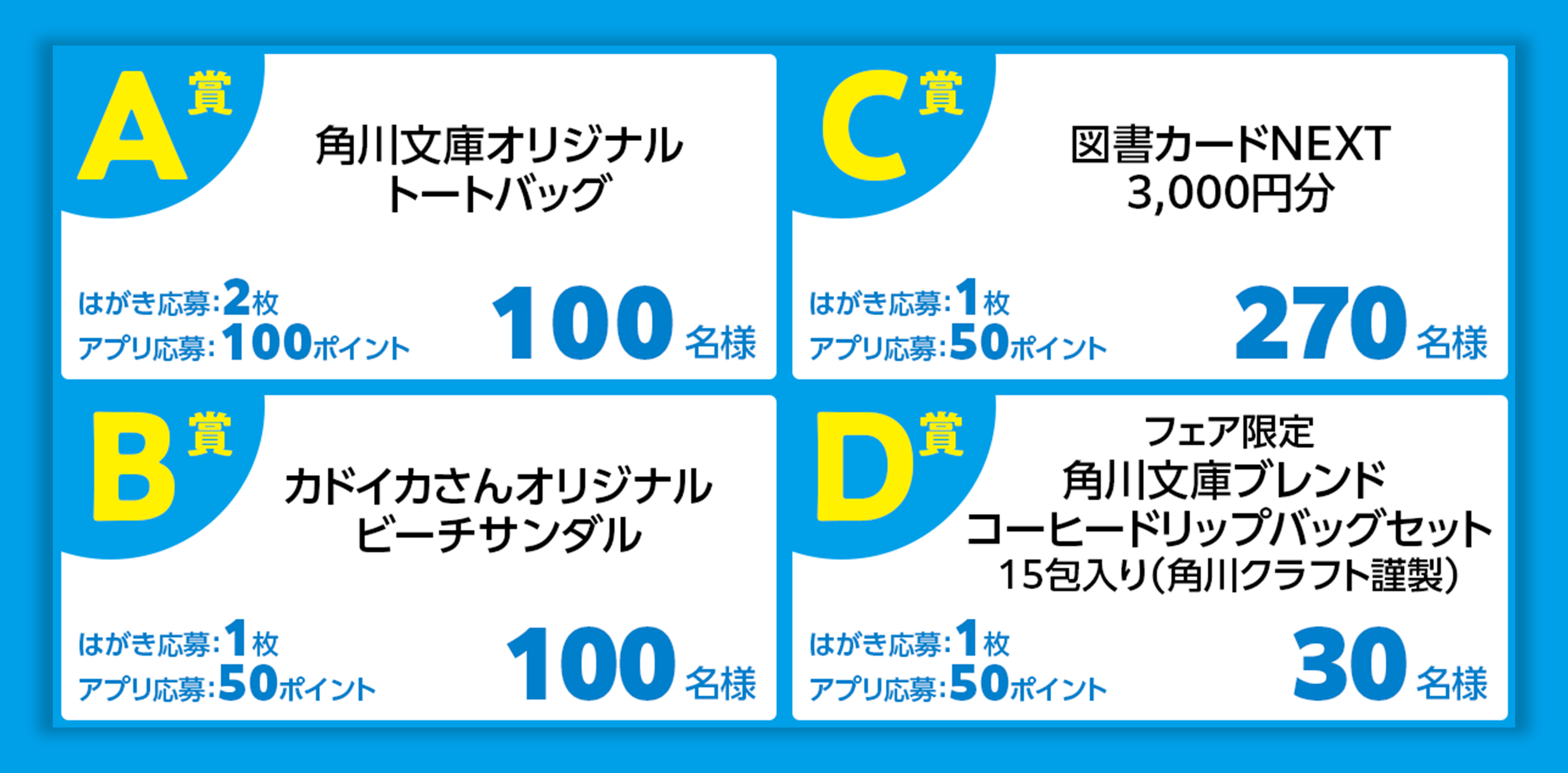 文庫の持ち歩きに便利な角川文庫オリジナルトートバッグや、暑い夏を楽しくするカドイカさんオリジナルビーチサンダルなど、ここでしか手に入らないプレゼントも。