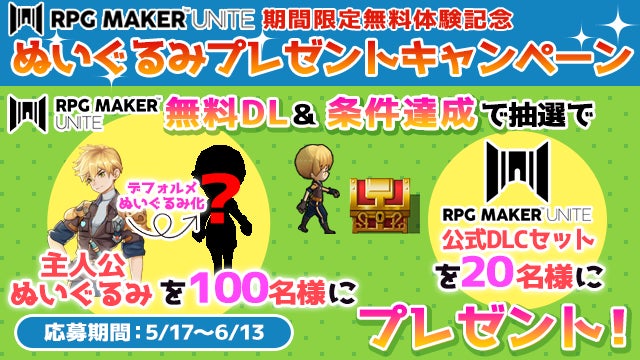 イベント開催を記念し、期間中に『RPG MAKER UNITE』をインストールし、スクリーンショットをX(旧Twitter)にハッシュタグをつけて投稿するだけで、抽選で100名様に主人公クラフトのぬいぐるみをプレゼントするキャンペーンを実施します!