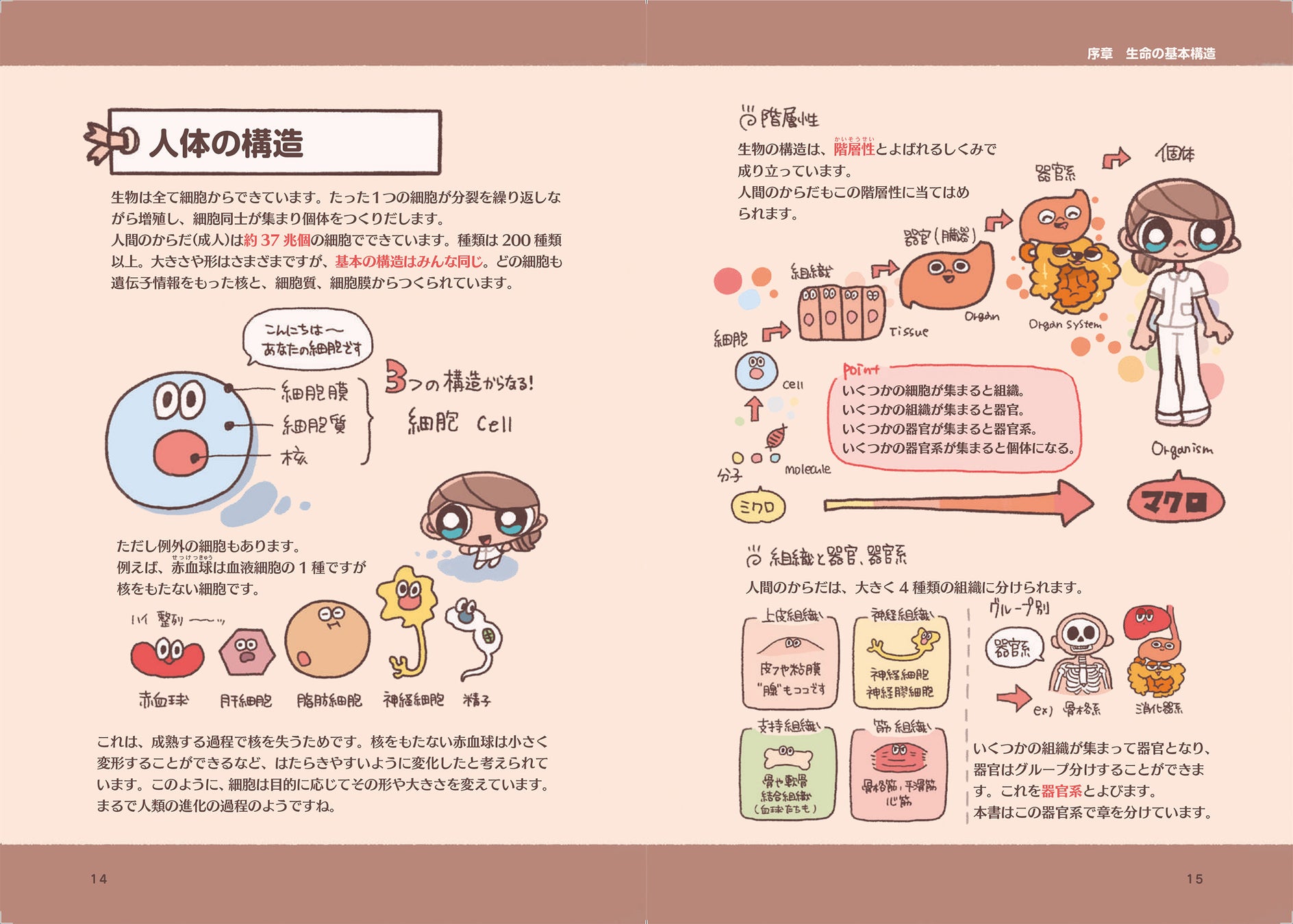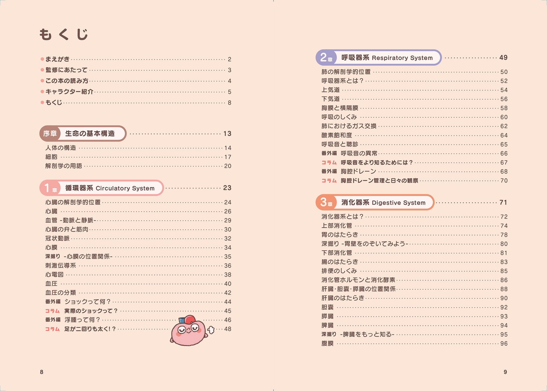 はじめに/キャラクター紹介/ぞうもつ紹介/序章:生命の基本構造/1章:循環器系/2章:呼吸器系/3章:消化器系/4章:脳・神経系/5章:泌尿器系/6章:血液・免疫系/7章:内分泌系/8章:運動器系/9章:感覚器系/おわりに/索引