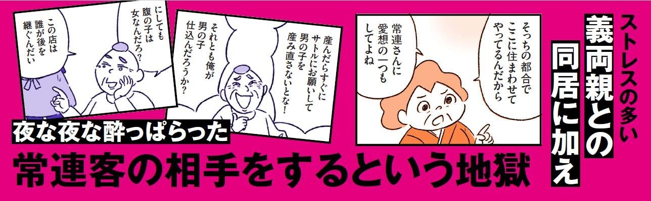 えストレスの多い義両親との同居に加え、夜な夜な酔っぱらった常連客の相手をするという地獄。実家で