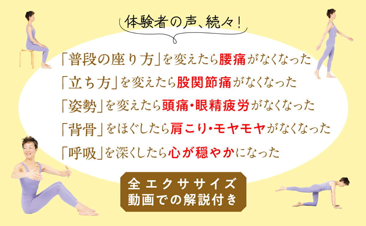 本書ではビギナーのための入門プログラムとして、全50エクササイズを収録。カレンダーつきで、すべて動画の解説もついており、運動が苦手な人も、年齢を重ねた人も、無理なく取り組めます。