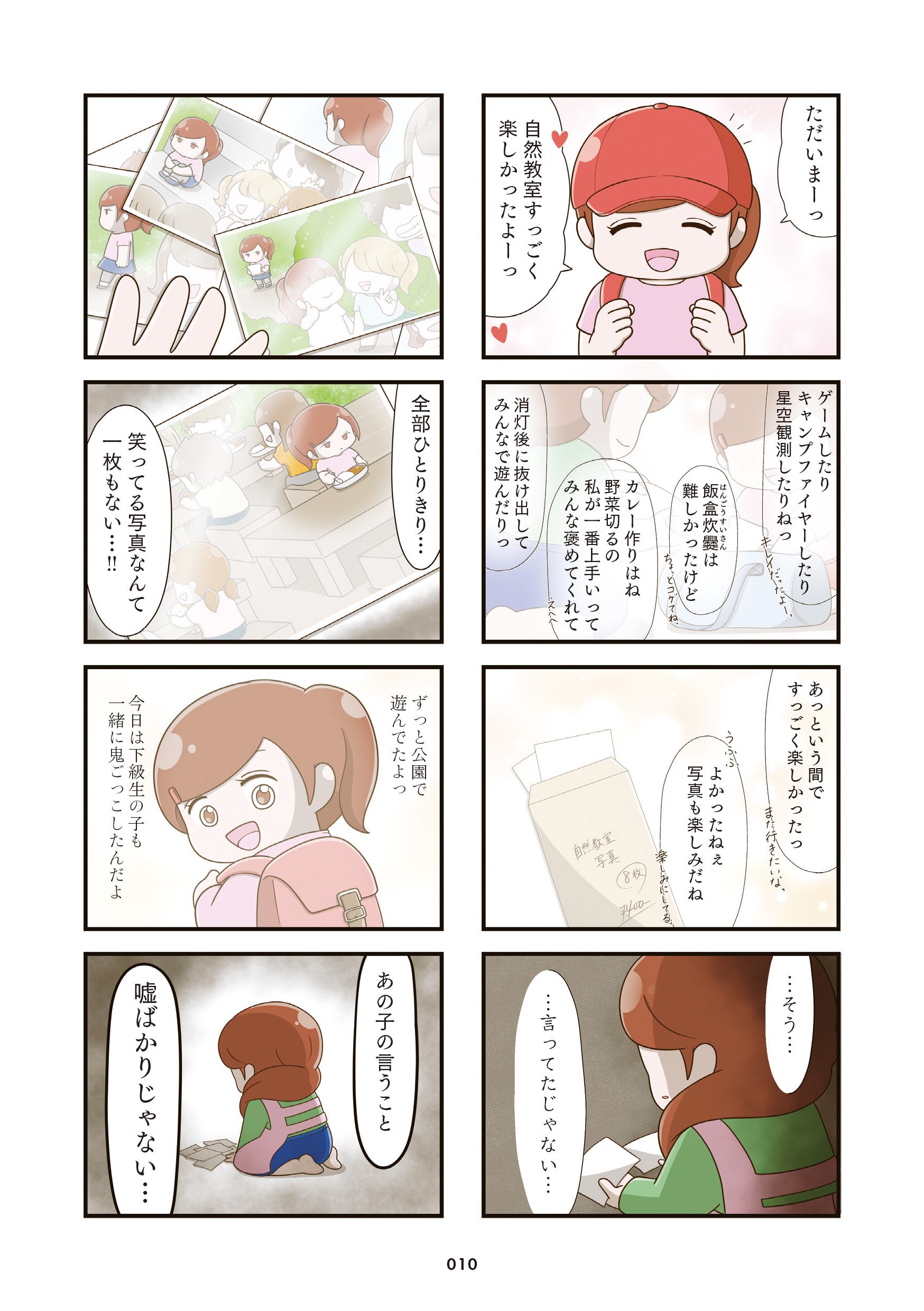 いじめの手がかりを探すため娘の部屋を探していると、自然教室での写真を見つけた。そこに写っていたのはひとりきりで過ごす娘の姿ばかり……。