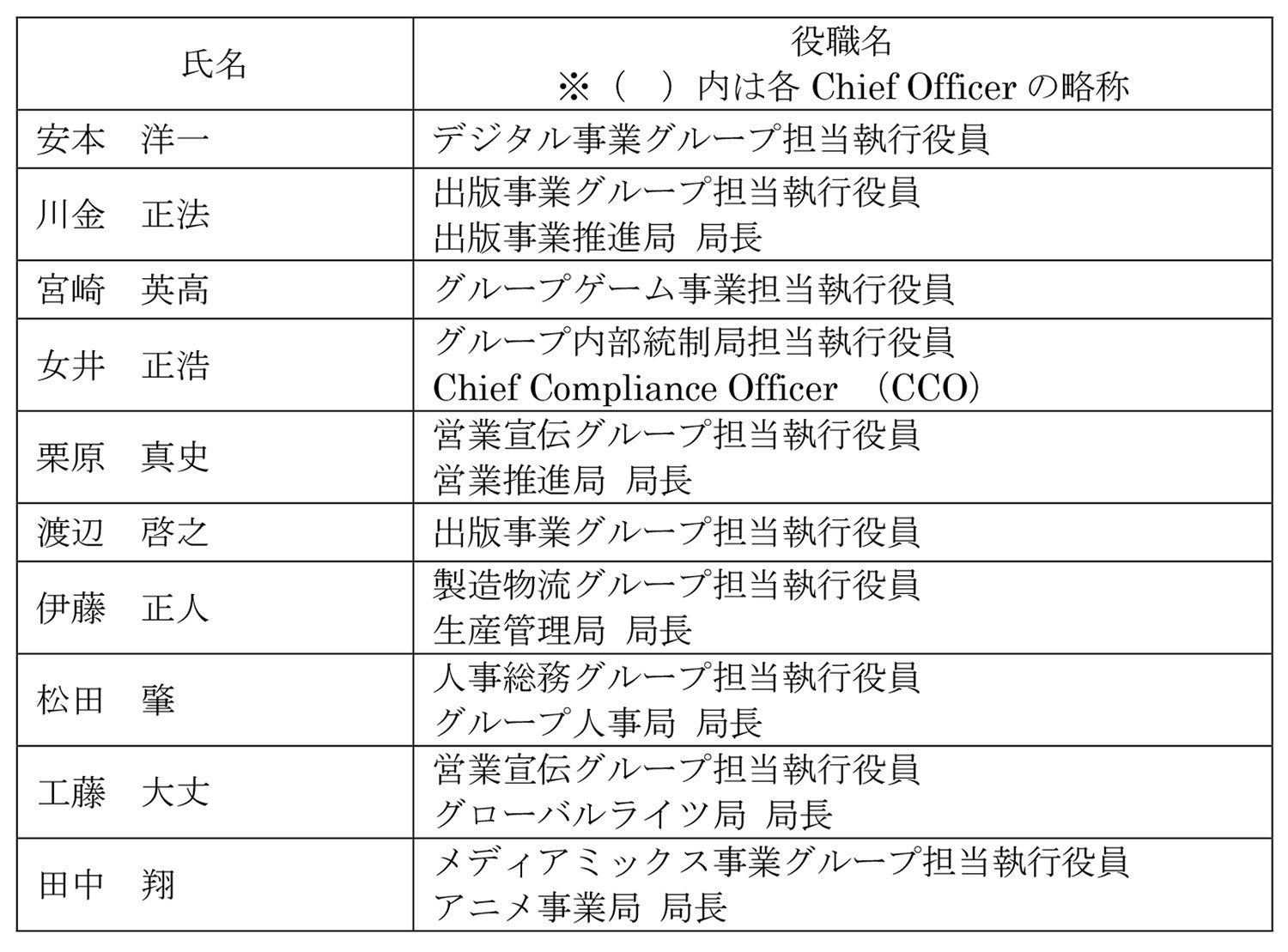 株式会社KADOKAWA(本社:東京都千代田区、取締役 代表執行役社長 CEO:夏野剛、以下 当社)は、2024年6月18日開催の第10期定時株主総会において、当社取締役の選任が決議されたことをお知らせいたします。また、その後に開催された臨時取締役会において、執行役および執行役員体制を決定いたしました。