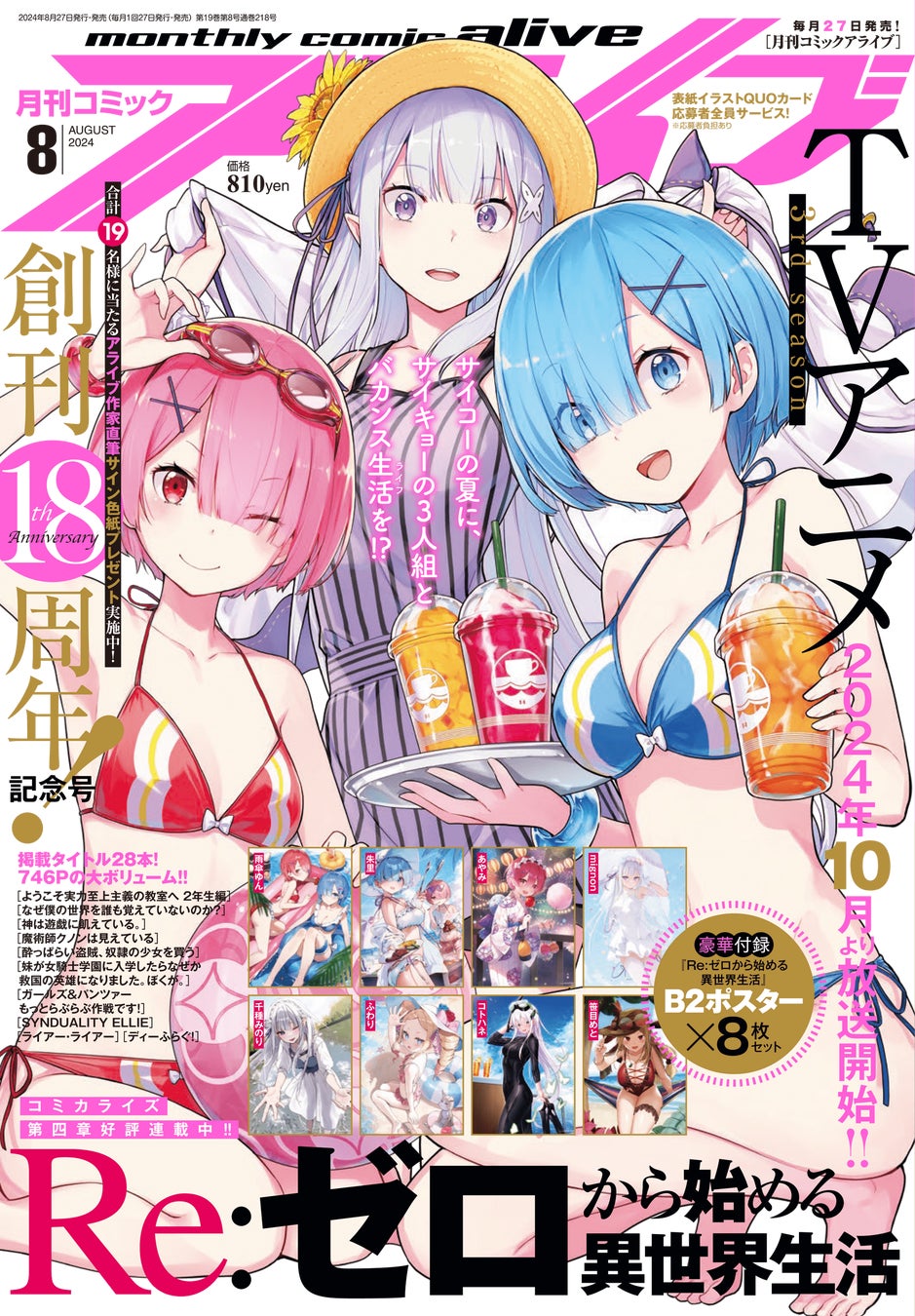 『月刊コミックアライブ』創刊18周年記念号となる2024年8月号の付録は、大人気イラストレーター陣による『Re:ゼロから始める異世界生活』の描き下ろしB2ポスター8枚セット!