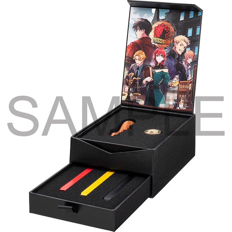 主人公・ダリヤが設立した「ロセッティ商会」の商会紋スタンプとシーリングワックスの3色セットが登場です! シーリングワックスはダリヤの髪の色をモチーフとした赤、ヴォルフの瞳の色をモチーフとした黄、ヴォルフの髪の色をモチーフとした黒の3色を用意。ダリヤの気分になって書類のサイン代わりや封蝋として使用したり、デコレーションアイテムとしても楽しめます。蓋の表面にロセッティ商会紋が、裏面には8巻カバーイラストが印刷された特製収納箱付き!! さらにカドカワストア限定購入特典として、甘岸久弥先生書き下ろしによるSS小冊子が付属!(「アニメ化記念複製サイン入りミストグラフ」の特典SS小冊子とは内容が異なります)