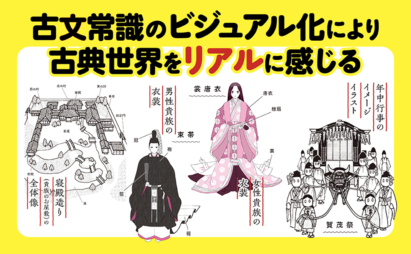 古文常識は、当時の社会状況や生活習慣を理解するための重要な知識です。本書では、視覚的なアプローチを取り入れ、古文常識をリアルに感じ取ることができます。例えば、源氏物語や女房たちが書いた日記類には、内裏(だいり、うち)での出来事が頻出です。そこで部屋の名称である「桐壺」「弘徽殿」のような言葉が出てきたときに、内裏での位置関係などを知っていたほうが情景を思い浮かべやすく、どんなことを伝えたいのかを理解しやすいでしょう。