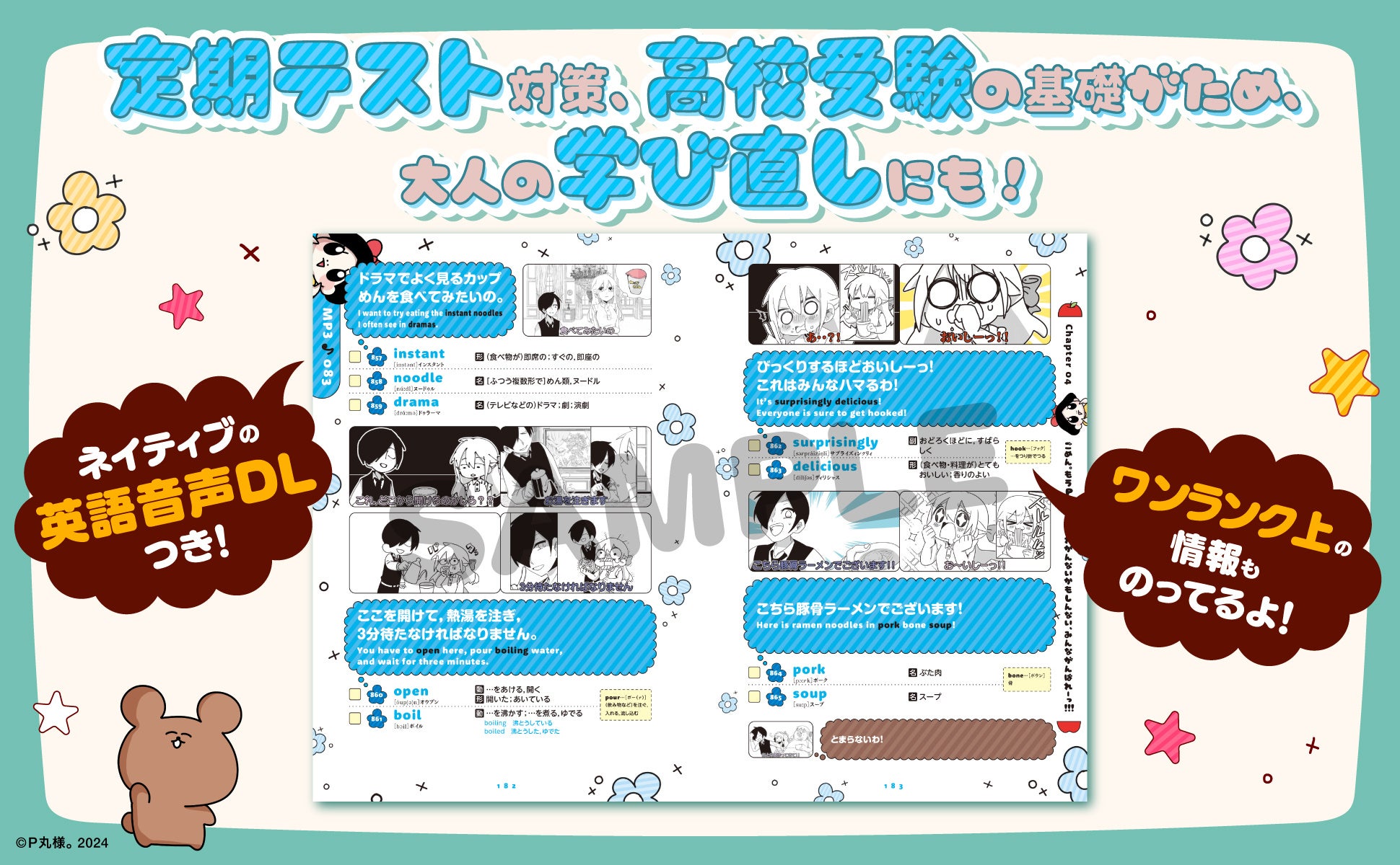 本書は、YouTube登録者数290万人超のマルチエンターテイナー「P丸様。」公式の英単語帳。P丸様。はもちろん、「ゆるふわ~」のキャラクターたちの楽しいセリフで、中学の基礎英単語1000語が覚えられる1冊です。