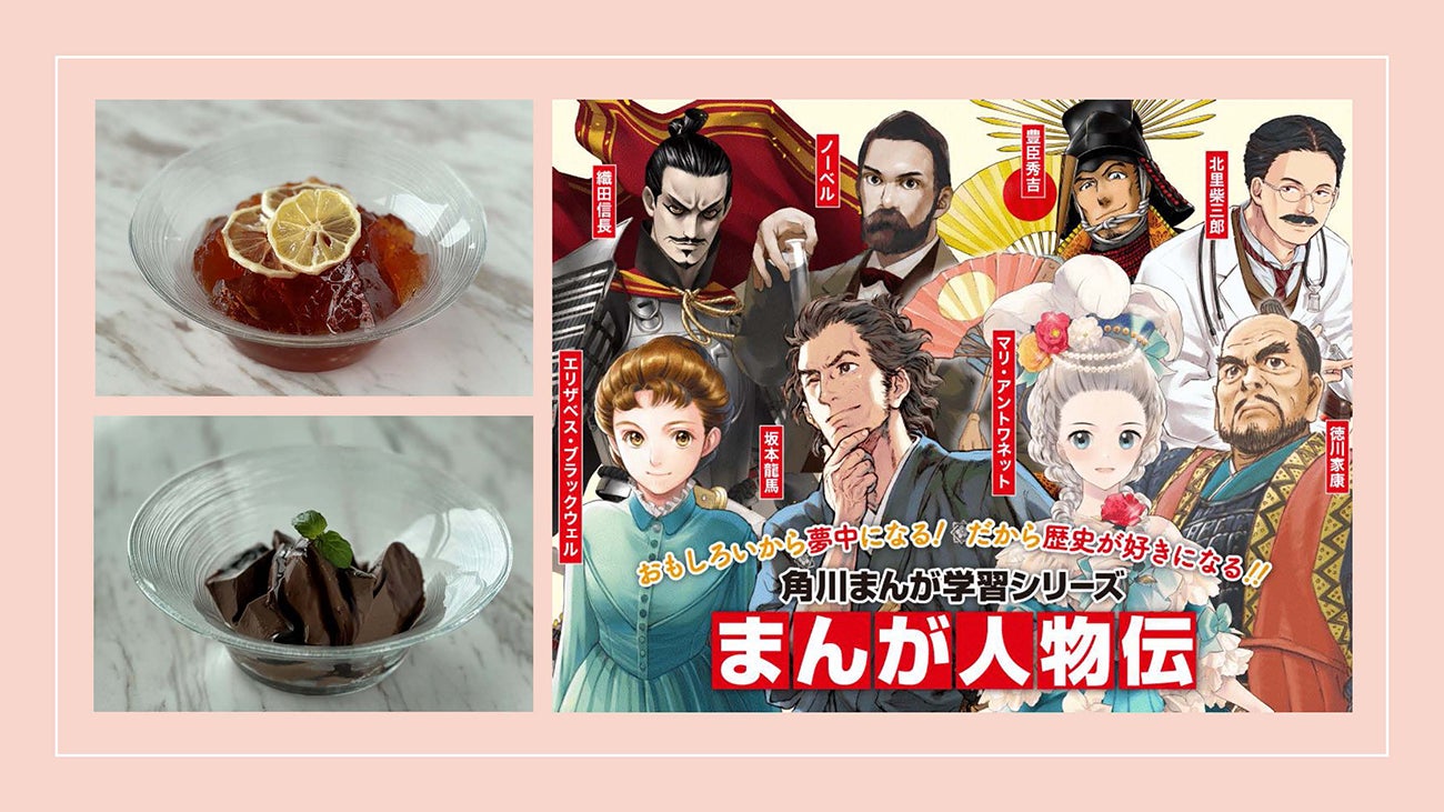 「まんが人物伝」とのコラボメニューには『エリザベス女王二世』からヒントを得た「レモンティゼリー ハチミツシロップがけ」と「ロイヤルチョコレートムース」が登場します!