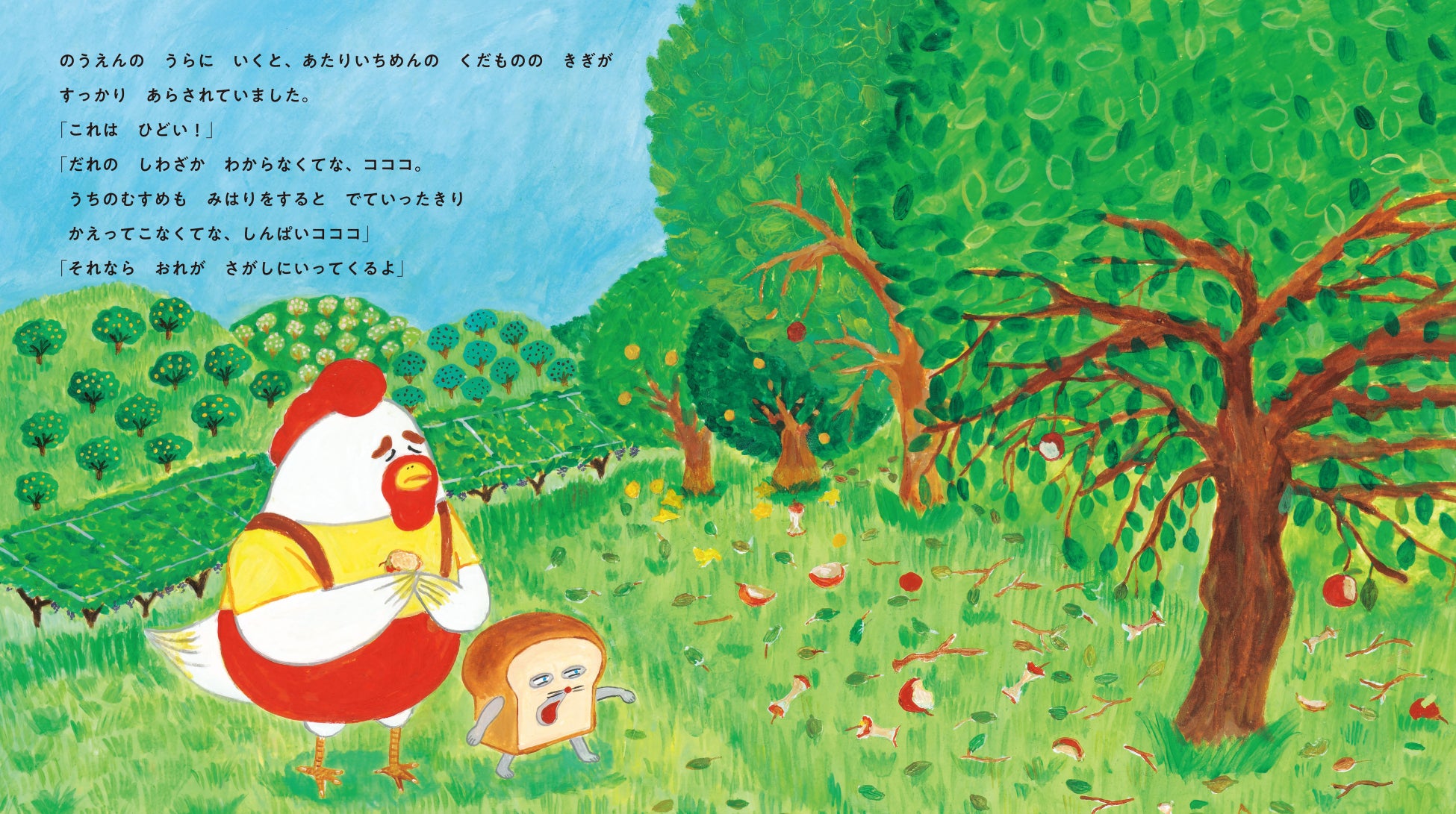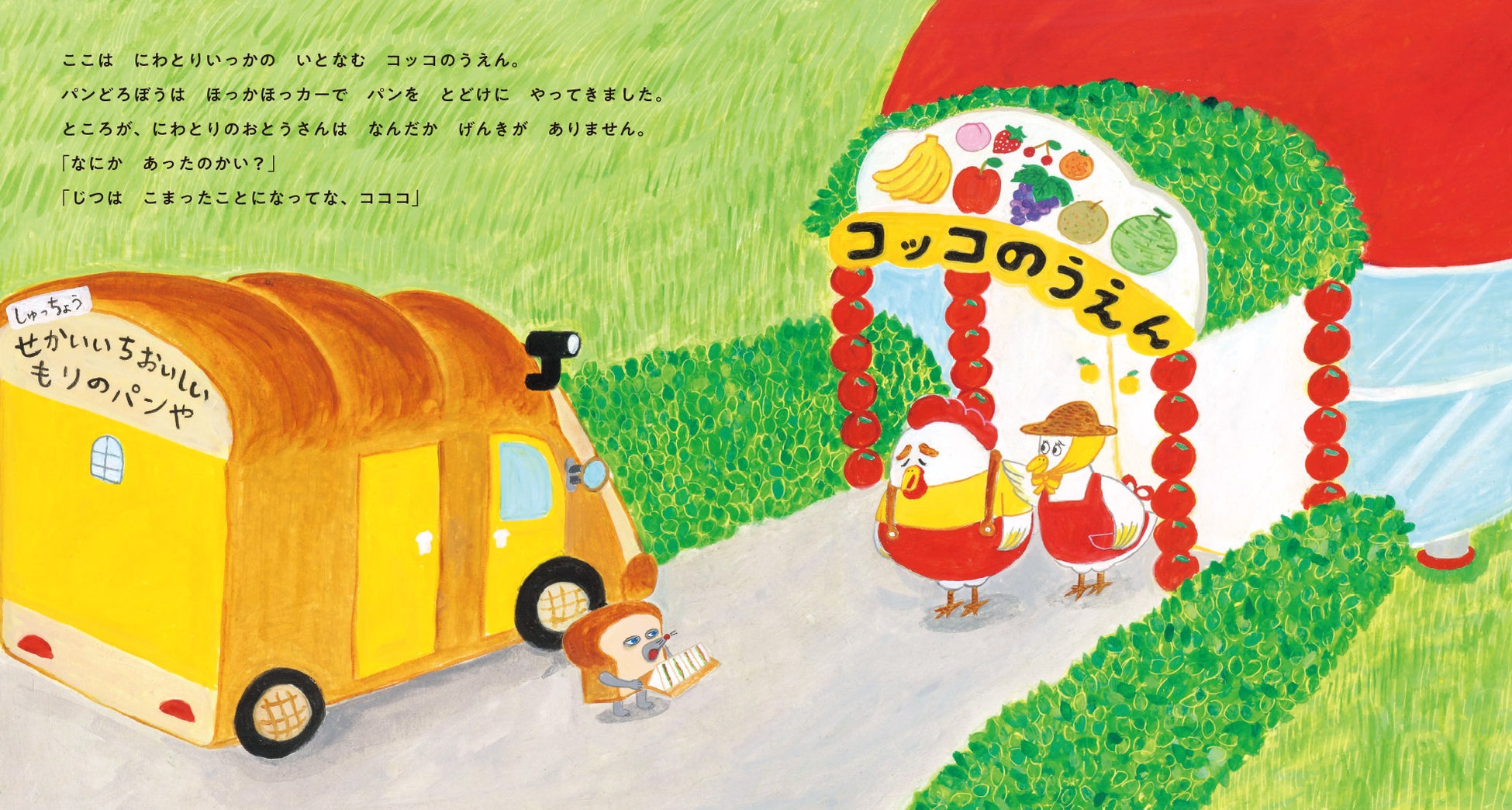 にわとり一家がいとなむコッコ農園へ、パンをとどけにやってきたパンどろぼう。