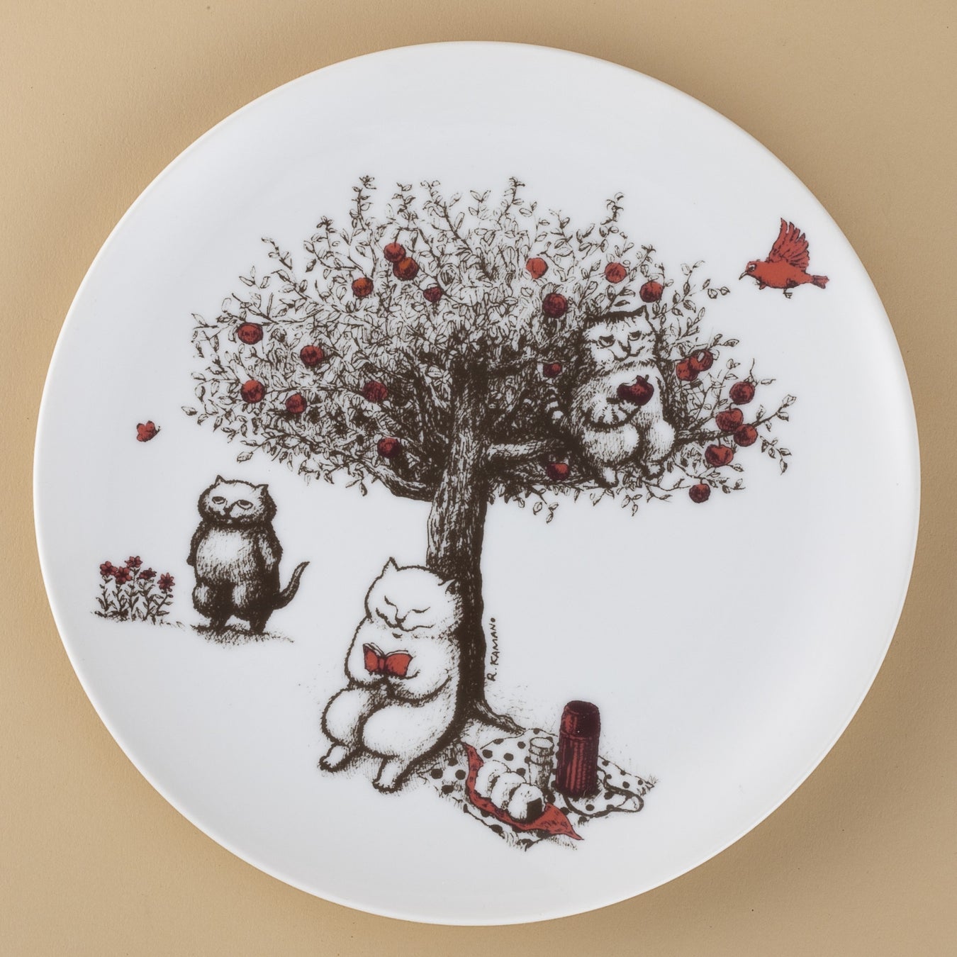 カマノレイコさんによる繊細なペン画をティータイムにぴったりなプレートに仕立てました。大きなリンゴの木のうえで三匹が思い思いにくつろぐ姿に癒されます。