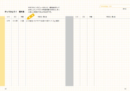 みんなで和気あいあいと作れるインタビューした親の歴史を元に書き起こす「親年表」ページも。
