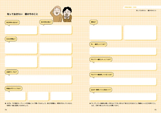 知っているようで知らない、親のこれまでの歴史や今の親の生活。好きなこと、苦手なことなど、聞きやすい質問項目からインタビューを始めることで楽しくスムーズなコミュニケーションが生まれます。