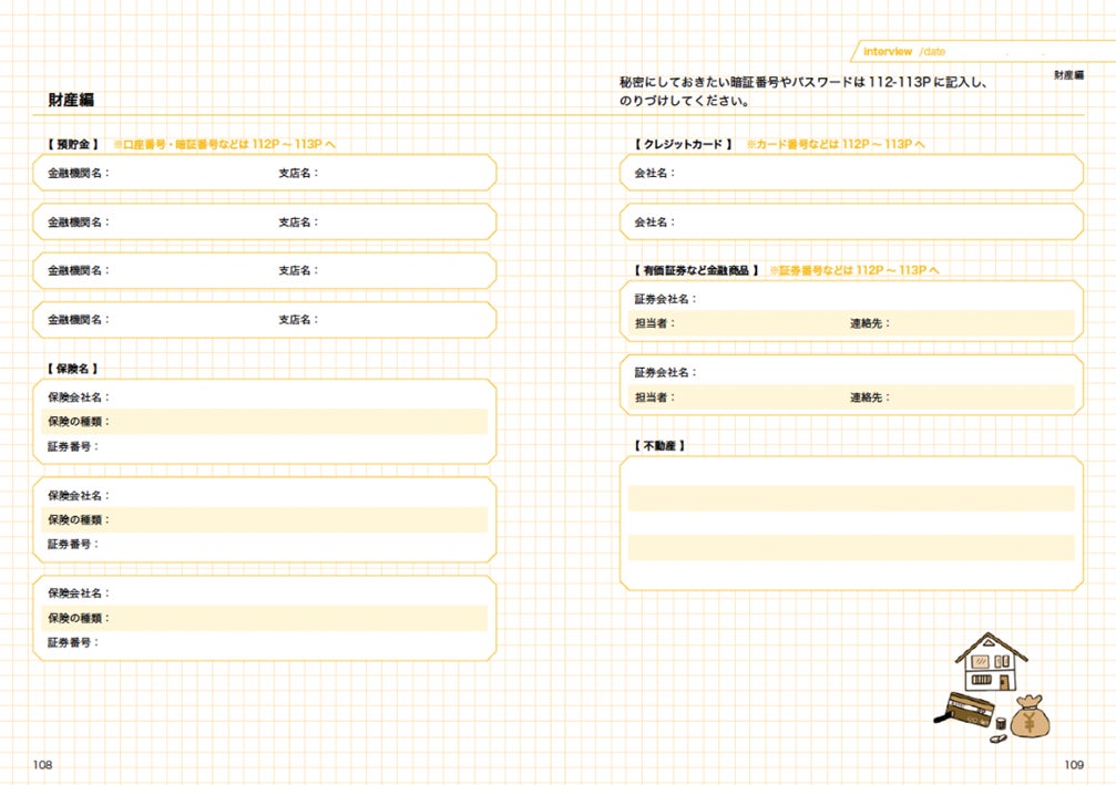 加入している保険や預貯金に関することなどもインタビューという形で書き記せます。