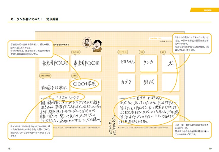 記入見本「カータンが書いてみた!」ページもカータンさんが親御さんにインタビューをした際のメモを元に、実際に記載したものを掲載。