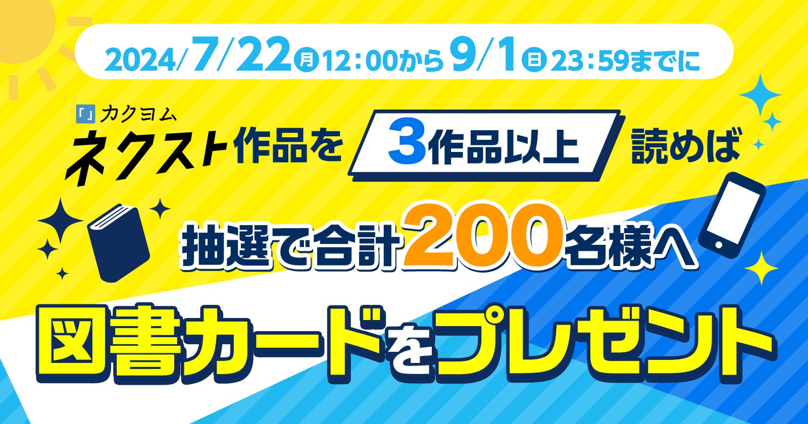 お目当ての作家を追いかける以外にも、お気に入りの作品が増えれば、毎日がきっと、さらに楽しくなる。せっかくだから、はじめましての作品も、無料で楽しめるこの時期に、ちょこっとつまみ読みしてみませんか? この期間にネクスト作品を3作品(5エピソード以上)読むだけで、なんと抽選で合計200名様に図書カードネットギフトがあたるというのだから、これは読まねばもったいない!