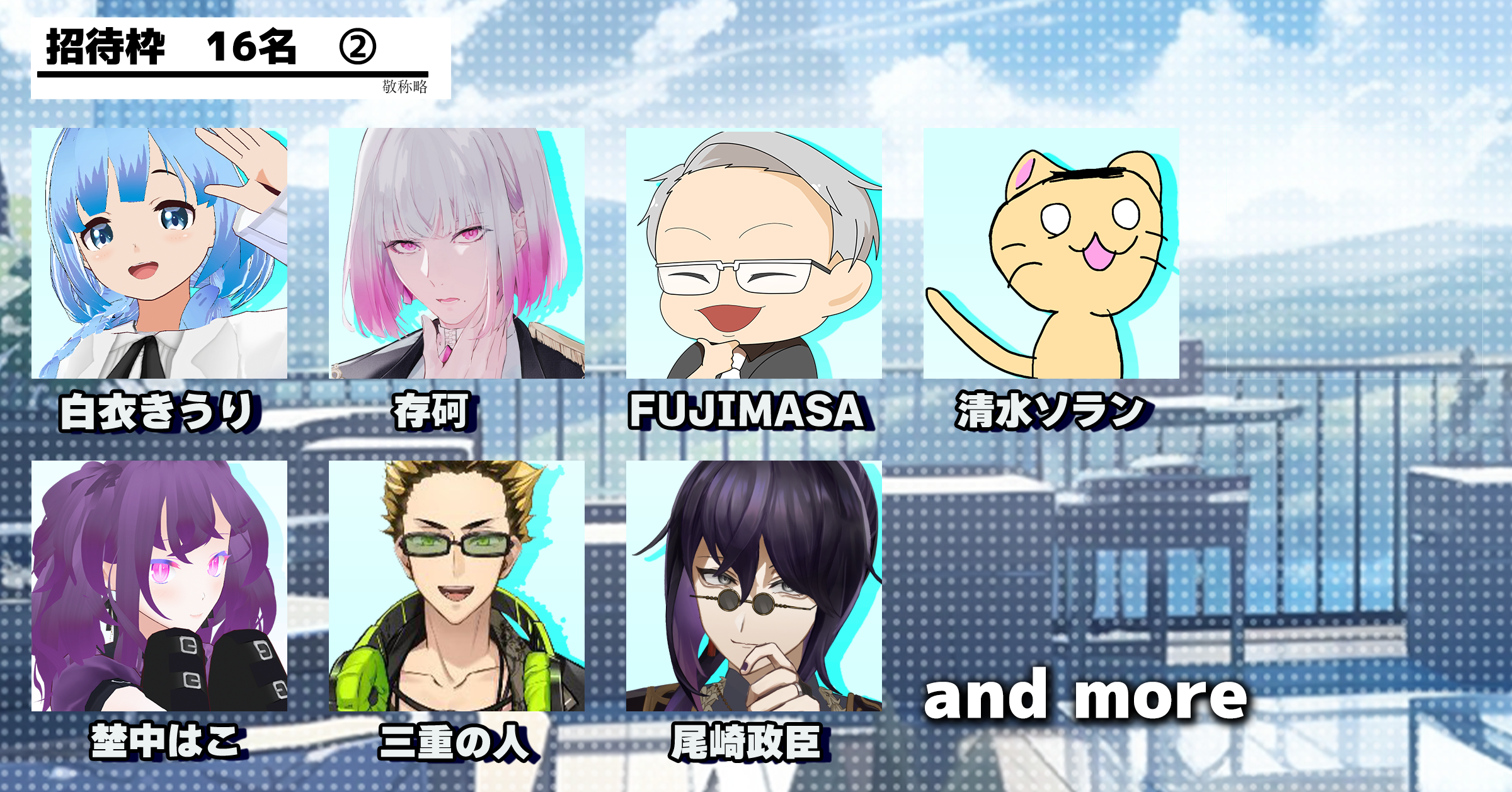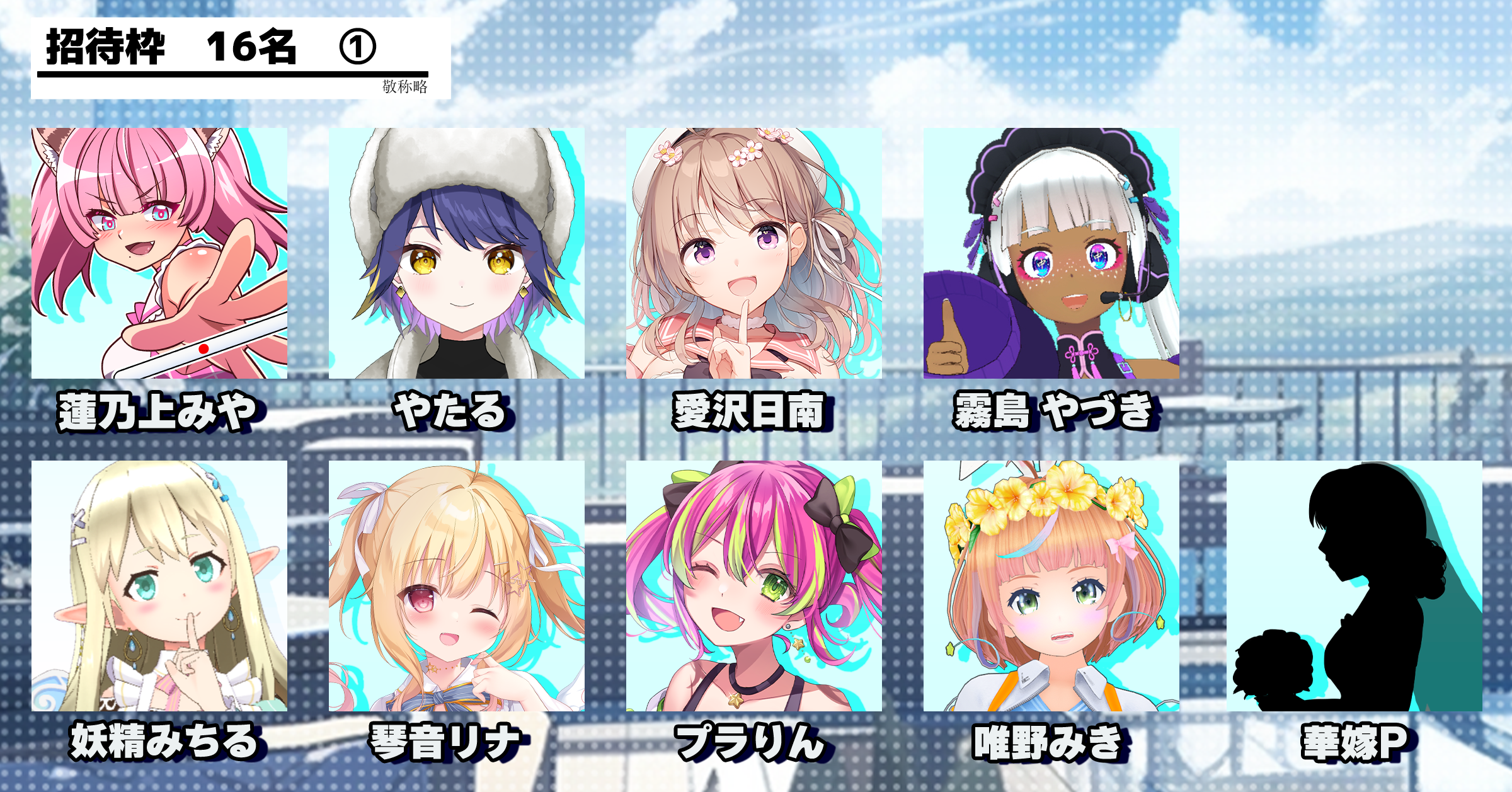 【招待枠(16名)】妖精みちる/埜中はこ/FUJIMASA/白衣きうり/霧島やづき/尾崎政臣/蓮乃上みや/三重の人/プラりん/存砢/華嫁P/やたる/愛沢日南/唯野みき/琴音リナ/清水ソラン